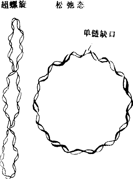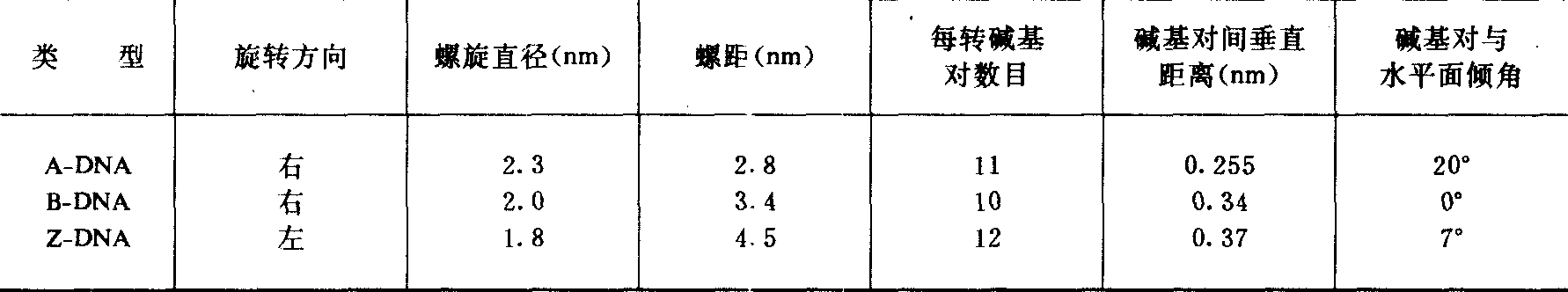 图574 环DNA的超螺旋结构 DNA分子太大,最小的病毒DNA约含5000个核苷酸。因此,DNA一级结构的测定比较困难,开展也较晚。70年代中后期,桑格 (F·Sanger)和吉尔伯特(W·Gilbert)分别创造了DNA一级结构的快速测定方法,并同获1980年度诺贝尔化学奖。现在已完成了一些DNA的一级结构测定,其中较大的有水稻叶绿体DNA,含134525个碱基对,λ噬菌体含有48502个碱基对。目前,许多科学家正致力于人染色体DNA的一级结构测定。应用X射线衍射技术,发现DNA纤维的二级结构主要有A和B两种类型。一般认为B型最接近细胞中的DNA构象,它与沃森和克里克1953年提出的DNA双螺旋模型非常相似。A-DNA与B-DNA有很大差别,二者的结构参数极不相同。A-DNA与RNA分子中的双螺旋区以及DNA-RNA杂交分子在溶液中的构象很接近,因此推测在转录时DNA分子发生“B→A”的转变。1979年用人工合成C、G相间排列的DNA片段晶体进行X-射线衍射分析,发现它有向左旋转的双螺旋结构。有人认为左手螺旋DNA在细胞中有调节功能,另外一些人则怀疑细胞DNA是否有此种结构。下表列出了各种类型DNA的一些结构参数。 双螺旋DNA的类型