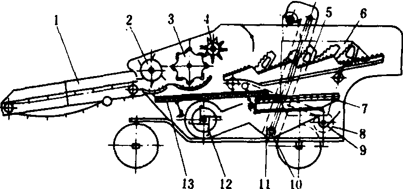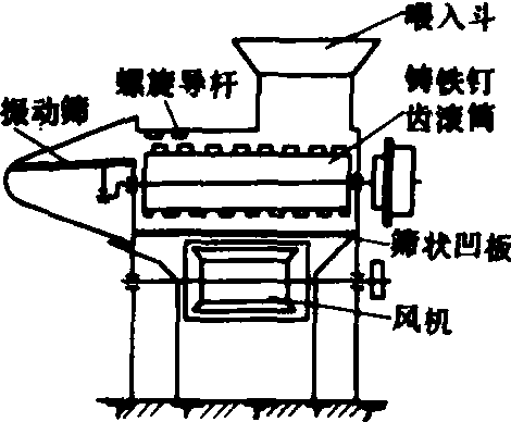 图1 复式脱粒机 1.喂入输送装置; 2.钉齿滚筒; 3.纹杆滚筒; 4.逐稿轮;5.逐稿器;6.第二清粮室; 7.清选筛;8.复脱器;9.杂余螺旋推运器; 10.籽粒螺旋推运器; 11.籽粒升运器;12.风机; 13.阶梯板 复脱器是将未脱粒的断穗重新脱粒,它联结在杂余螺旋推运器的末端。复脱器有锥筒式和叶片搓板式两种。锥筒式由内壁装有U形搓板的锥筒(作为凹板)、按锥筒母线方向安装短纹杆的锥形滚筒及抛掷叶轮组成。由杂余螺旋输送器送来的断穗经纹杆与搓板搓擦而脱粒,再由抛掷叶轮沿管路掷入清选装置重新清选。叶片搓板式复脱器的U形搓板安装在圆筒内壁,抛掷叶轮的叶片带动断穗冲击搓板而进行脱粒,随后叶片又将脱下的籽粒沿管路抛掷入清选装置。 除芒器的作用是除去籽粒上的芒刺和稃皮,还能清除泥土,使籽粒具有光泽的表面。除芒器有杆式和板式,它们以螺旋线排列固定在轴上,轴高速旋转,边推送边捣击物料,利用杆或板的打击和物料本身的相互搓擦而将稃芒脱除。除芒器的入口端有一旁路,当籽粒不需除芒时可由旁路直接进入第二清粮室。 集糠装置包括风机和管道。通用型风机安装在清粮室一侧,利用它产生的气流将颖糠吸出,并通过集糠管道将颖糠直接堆卸在场上。 轴流滚筒式脱粒机 由轴流杆齿脱粒装置和清选装置组成。作业时作物由脱粒滚筒一端轴向或切向喂入,随滚筒呈螺旋线沿滚筒轴向流动,作物受脱粒元件的撞击、揉搓被脱粒。籽粒和碎草自凹板筛孔漏下,由清选装置进行风选,脱粒后的长秸秆从脱粒滚筒末端排出。与切流滚筒式相比,轴流滚筒式具有脱粒行程长、脱粒间隙大的特点。它是采取作用强度较缓和、作用时间长、反复次数多的原理脱粒,因而籽粒损伤小,适于易损伤的作物如大豆和玉米的脱粒。由于脱粒时间较长,籽粒和长秸秆得以全部分离,因此不再需要分离装置。简式的轴流滚筒脱粒机也无清选装置。轴流滚筒式脱粒机功率消耗较大,秸秆破碎严重,脱水稻时虽然籽粒能保持完整,但茎秆容易拧成辫子,尤其在茎秆长、湿度大时。 图2是专用于脱玉米粒的轴流滚筒式脱粒机,亦称玉米脱粒机。它由喂入斗、铸铁钉齿滚筒、螺旋导杆、筛状凹板、振动筛、风机等组成。果穗由滚筒一侧的喂入斗切向喂入滚筒脱粒间隙后,沿滚筒轴向移动,经滚筒钉齿对玉米穗的冲击和玉米穗与滚筒、凹板之间的搓擦而脱粒。籽粒混杂物从凹板孔漏下,混杂物被风扇气流吹走,玉米籽粒则由出粮口落到地面。玉米芯由滚筒轴端排出后,经振动筛面排出机外,夹带的玉米籽粒则通过筛面而被回收,同样从出粮口落到地面。