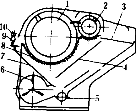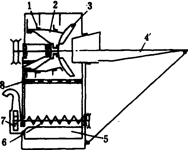 图3 叶轮式脱粒机 1.滚筒刀片; 2.推送滚筒; 3.脱粒叶轮; 4.喂入台; 5.风机; 6.籽粒螺旋推运器; 7.扬谷轮; 8.凹板筛