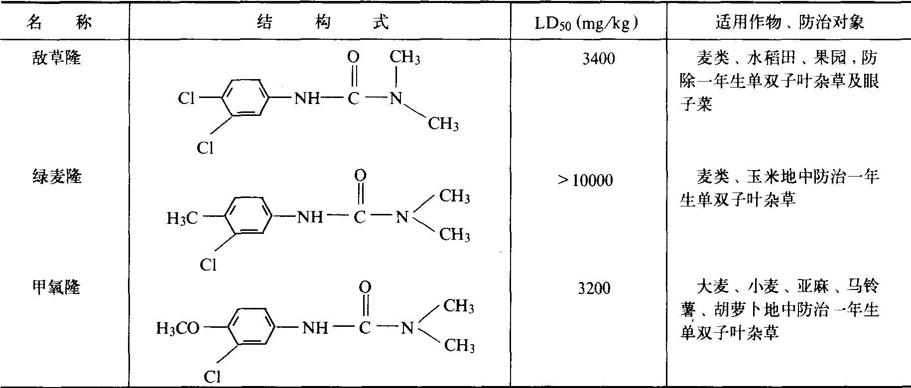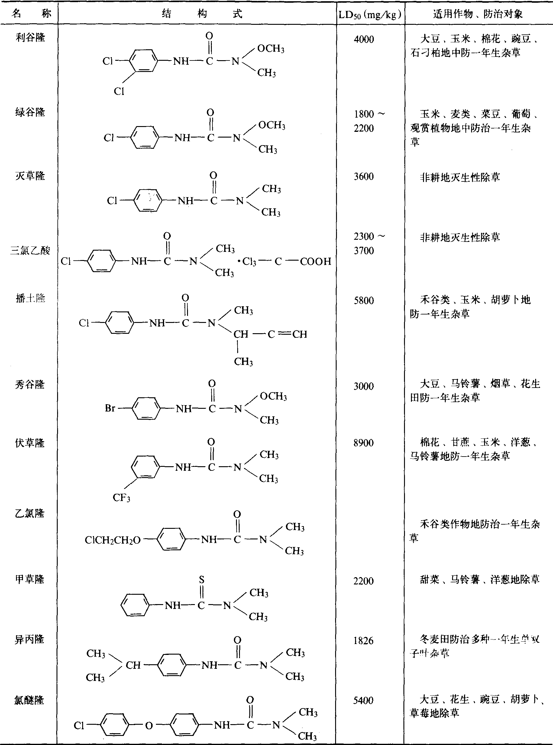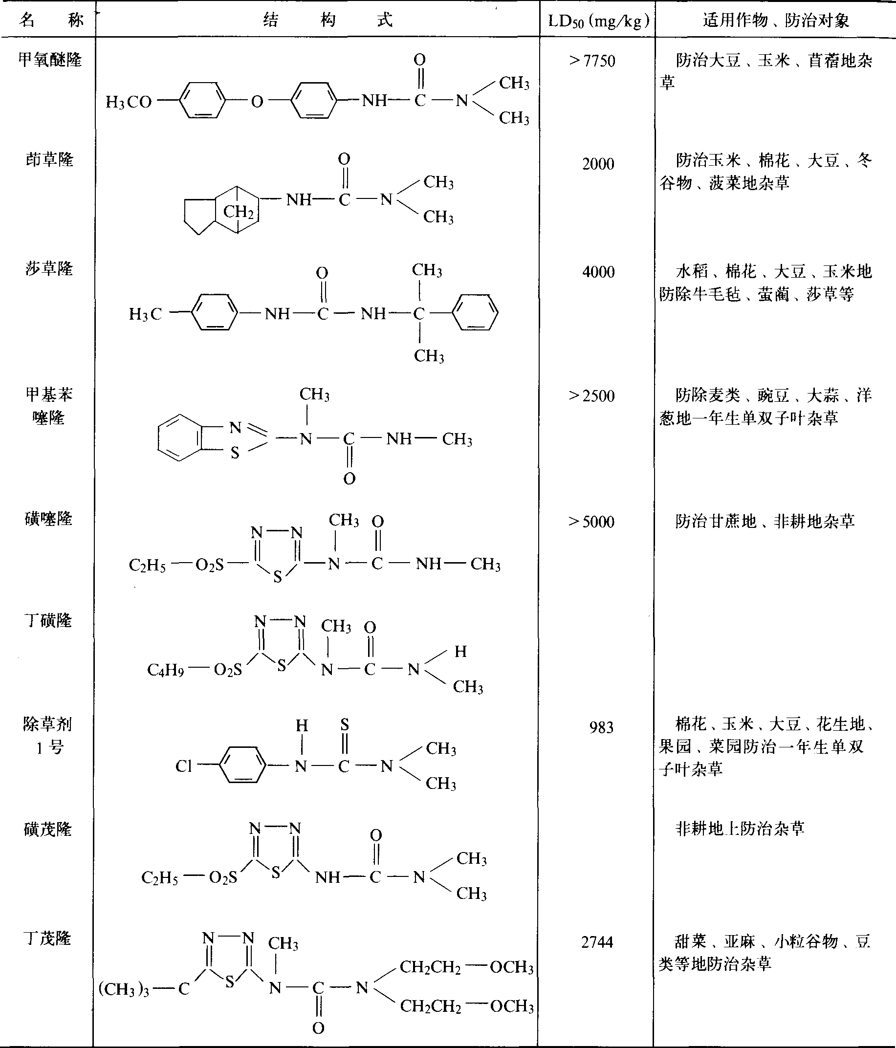 R1为芳基、脂环基或杂环基,在大多数情况下为苯环;R2与R3分别为低烷基及烷氧基等。40年代前期已报道了取代脲类化合物有抑制植物生长的活性。1951年布查(H.C.Bucha)和托德(C.W.Todd)首先报道了灭草隆的除草活性,此后,许多脲类除草剂品种陆续出现,成为除草剂中重要的一类。1978年列维特(G.Levitt)等最先报道了取代脲、苯磺基与三氮苯基结合创造出高效新型除草剂——磺酰脲类除草剂,其除草活性极高如绿磺隆每公顷用量4~60克,使除草剂发展进入新的阶段。 分类 脲类除草剂主要品种如下表。 脲 类 除 草 剂 主 要 品 种