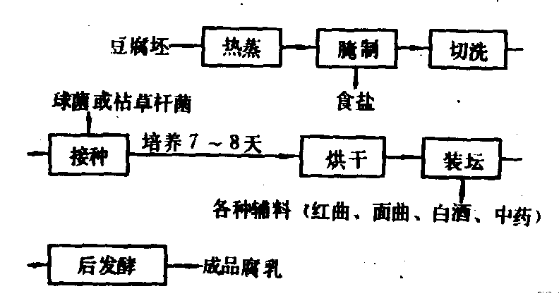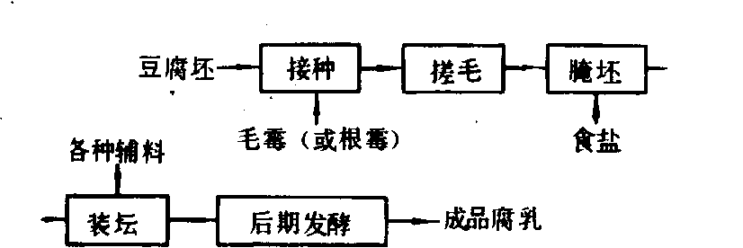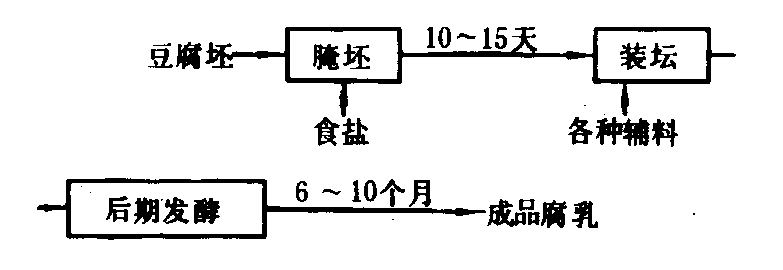 制腐乳前先准备豆腐坯。豆腐坯的制作与普通豆腐的制作方法基本相同(见豆腐加工),区别在于加入凝固剂时要充分搅拌,使凝固蛋白质汇合机会减少,制成易于脱水的豆腐。一般采用油压机压榨成型。成型后的豆腐应厚薄均匀;细软而有弹性,一般臭豆腐坯子的含水率为66%~69%,酱豆腐71%~74%。根据不同尺寸的要求切制成豆腐坯,为腌制、发酵处理作准备。 腐乳的一般生产工艺流程(图1)特点是豆腐坯不经前期发酵而直接进入后期发酵。由于所分泌的蛋白酶的不足,豆腐坯内蛋白质的水解速度慢,导致后期发酵时间长,一般为6~10个月。腌坯时需加入食盐,以缩短豆腐坯与空间接触时间,防止细菌浸入和繁殖,减少污染。利用此工艺生产的豆腐乳具备传统的豆腐乳风味,但与经过前期发酵的腐乳相比,在色、香、味上稍有逊色,质地不够细腻,色泽不够纯正。