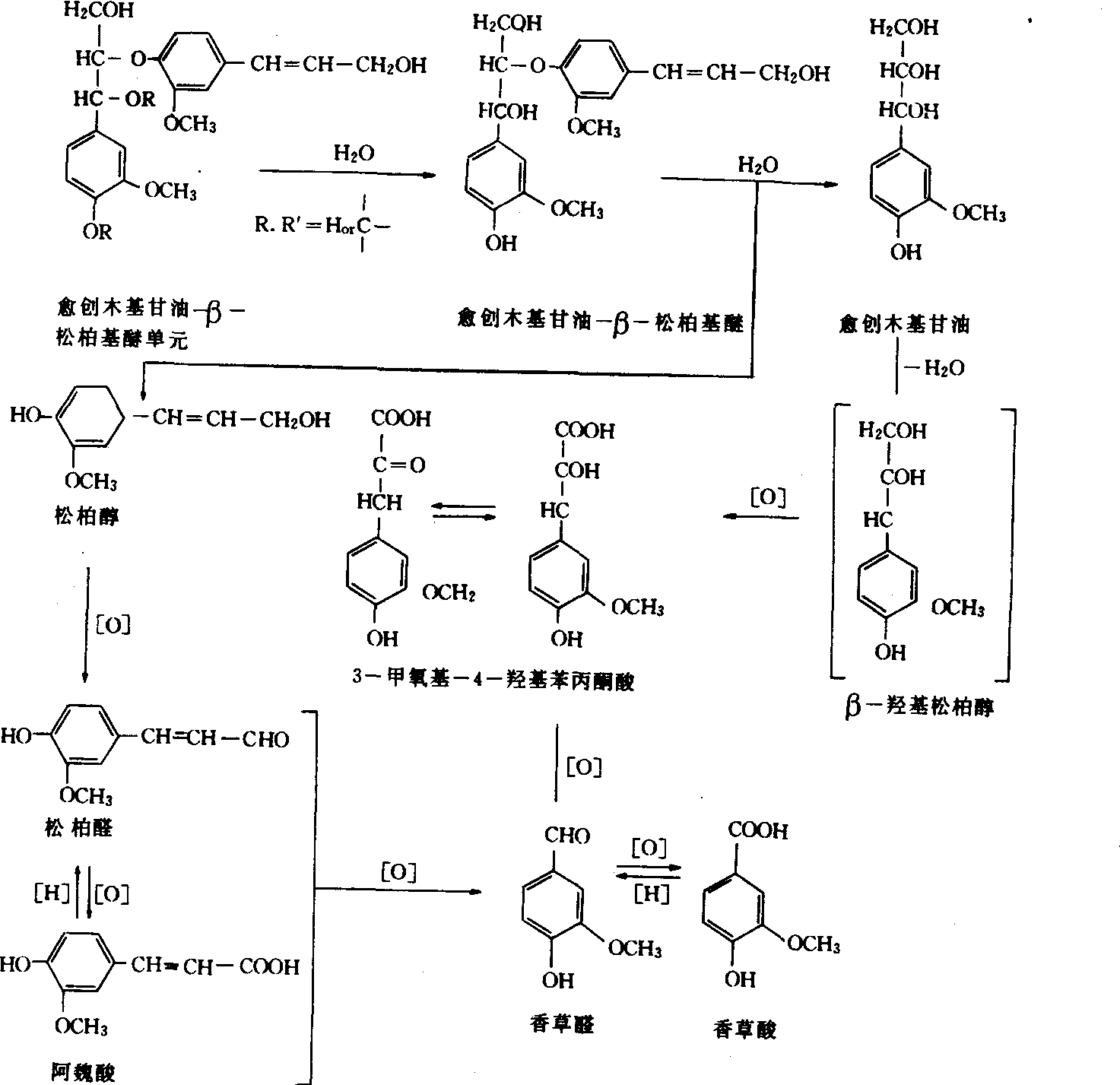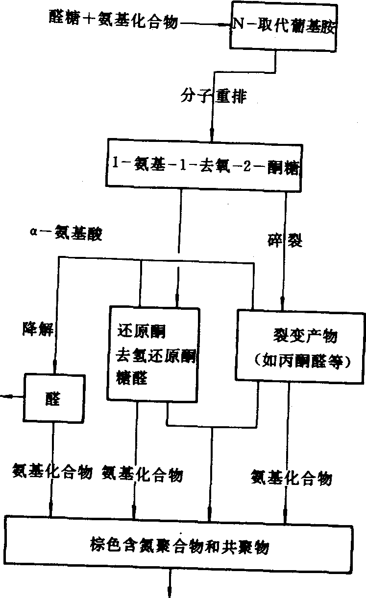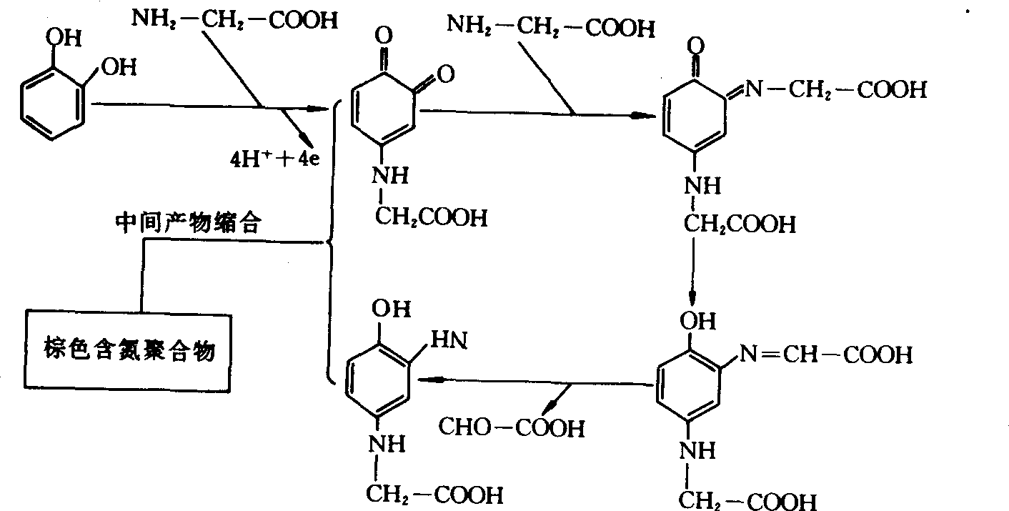腐殖物质的合成 已知的、非特殊本性的化合物在酶或土壤中无机组成分的接触作用下,通过包括自由基在内的多种反应,形成一种活细胞内都没有的、棕至褐色的天然有机高分子化合物的过程。这一过程与动、植物残体分解过程伴随进行。柯诺诺娃(M.M.Kononova)指出,当粘细菌分解纤维、而木质素尚未开始分解时,即有腐殖物质形成。土壤腐殖物质的形成途径,一般认为有下列几种。 多酚和含氮化合物的缩合反应 各种一羟基、二羟基和三羟基酚以及芳族酸都是形成腐殖物质的结构单元。这些多酚在多酚氧化酶等的作用下,或者仅在空气中氧的作用下氧化为醌。在氨基酸、多肽或蛋白质存在的条件下,该氧化作用大大加速并形成芳族胺,后者进一步缩合成腐殖物质(图2)。 各种一羟基、二羟基和三羟基酚以及芳族酸既可以是木质素的降解产物,也可以是放线菌、真菌和细菌等各种微生物利用非芳族物质合成的产物。因此,植物残体中的各种组成分都可以是形成腐殖物质的原料。 木质素与含氮化合物的缩合反应 木质素在细菌胞外酶的作用下,在未被降解为苯丙烷结构的单体前,脱去甲氧基生成新的酚羟基,同时支链或支链顶端氧化形成羧基。这种经改变后的木质素在酶的作用下氧化为醌型化合物,后者与氨或氨基化合物形成醌亚胺,醌亚胺进一步缩合成腐殖物质。 糖与胺的缩合反应 还原糖与氨基酸等胺类化合物首先通过加成反应形成希夫(Schiff)碱和N-取代葡基胺,后者通过分子重排生成N-取代-1-氨基-1-去氧-2-酮糖,该酮糖的碎裂产物包括各种三碳链的醛和酮,以及脱水产物如还原酮和羟甲基糠醛等与氨基化合物缩聚成腐殖物质(图3)。