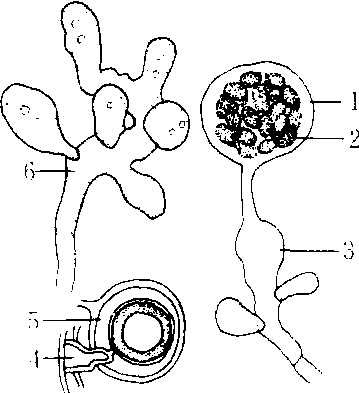 腐霉属 1. 泡囊 2. 游动孢子 3. 孢子囊 4. 雄器 5. 藏卵器 6. 孢子囊 |