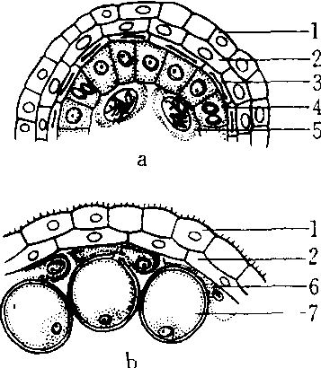 不同发育时期的小麦花粉囊 a.花粉母细胞减数分裂时期 b.小孢子时期 1. 表皮 2. 药室内壁 3. 中层 4. 绒毡层 5. 小孢子母细胞 6. 逐渐解体中的绒毡层 7.小孢子(单胞花粉粒) |