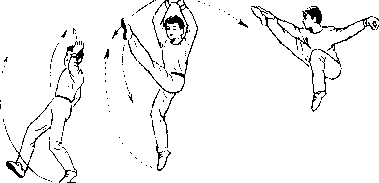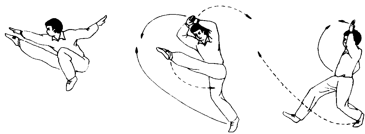 腾空飞脚 腾空飞脚Tengkong feijiao又称二起脚。为右脚起跳后两手击拍与右手、右脚相击拍依次完成的腾空动作。