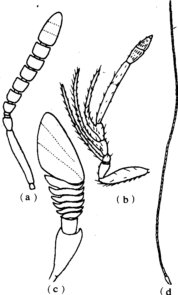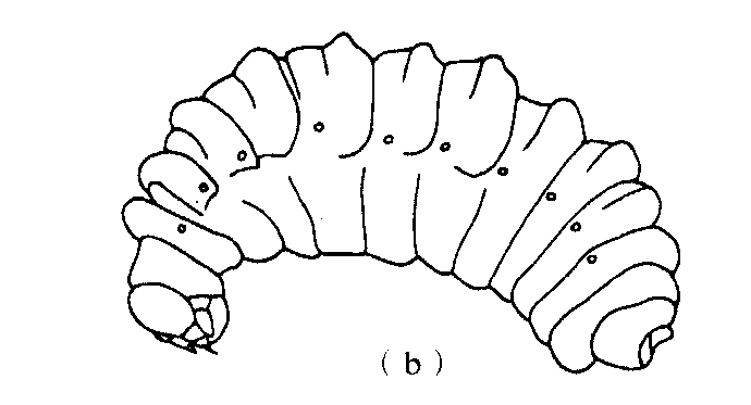 体长差异较大,微小的如赤眼蜂、缨小蜂体长仅2毫米; 大的长达40~50厘米;若包括产卵器长度,有些寄生类群可达115毫米,如姬蜂。体色一般较暗,也有的具金属光泽; 体壁柔软(大多数小型寄生蜂)或较坚硬(胡蜂、甲腹茧蜂等),一般体表光滑少毛,蜜蜂则密被分枝状的绒毛。雌雄异态现象普遍。 幼期 寄生性类群的卵一般具有柄。幼虫一般具头部、3个胸节及9~10个腹节。由于食性及生活习性不同,可分两类: 一类是蠋型(图3a),如广腰亚目幼虫通常有毛斑;多足; 头部骨化强; 具触角及下颚须:上颚强大,超过一齿; 常有单眼; 胸足发达 (少数退化),常有腹足,如长节锯蜂科有10对,叶蜂总科有6~8对,潜叶及作虫瘿的腹足退化或完全消失,但体仍为蠋型。蠋型幼虫自由生活,或取食植物的外部,或蛀食植物组织内部,偶有形成虫瘿者。第二类是无足型(图3b),如细腰亚目幼虫,无色斑,无足,头部骨化弱,口器及触角退化,触角柔软不分节,下颚须乳突状; 上颚弱,顶齿不超过一个; 无单眼,蛆形幼虫不活动,寄生或拟寄生或生活于由母蜂已准备好的饲料中或由工蜂喂食(社会性种类),少数在植物上作虫瘿。离蛹,一般具茧。