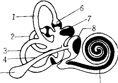 左耳迷路 1.上半规管 2.外半规管 3.后半规管 4.内淋巴管 5.内淋巴囊 6.壶腹嵴 7.椭圆囊斑 8.球囊斑 9. 螺旋器 |