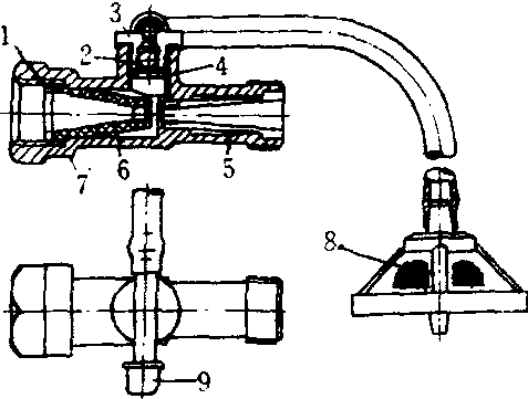 喷射式混药器 1.垫圈 2. 玻璃球 3. T型接头 4.销套 5.衬套 6.射嘴 7. 壳体 8. 吸药滤网 9. 管封 |