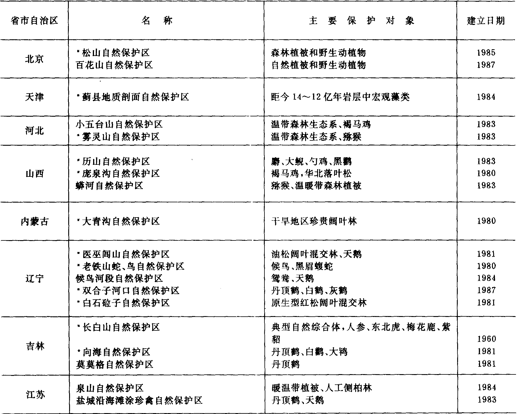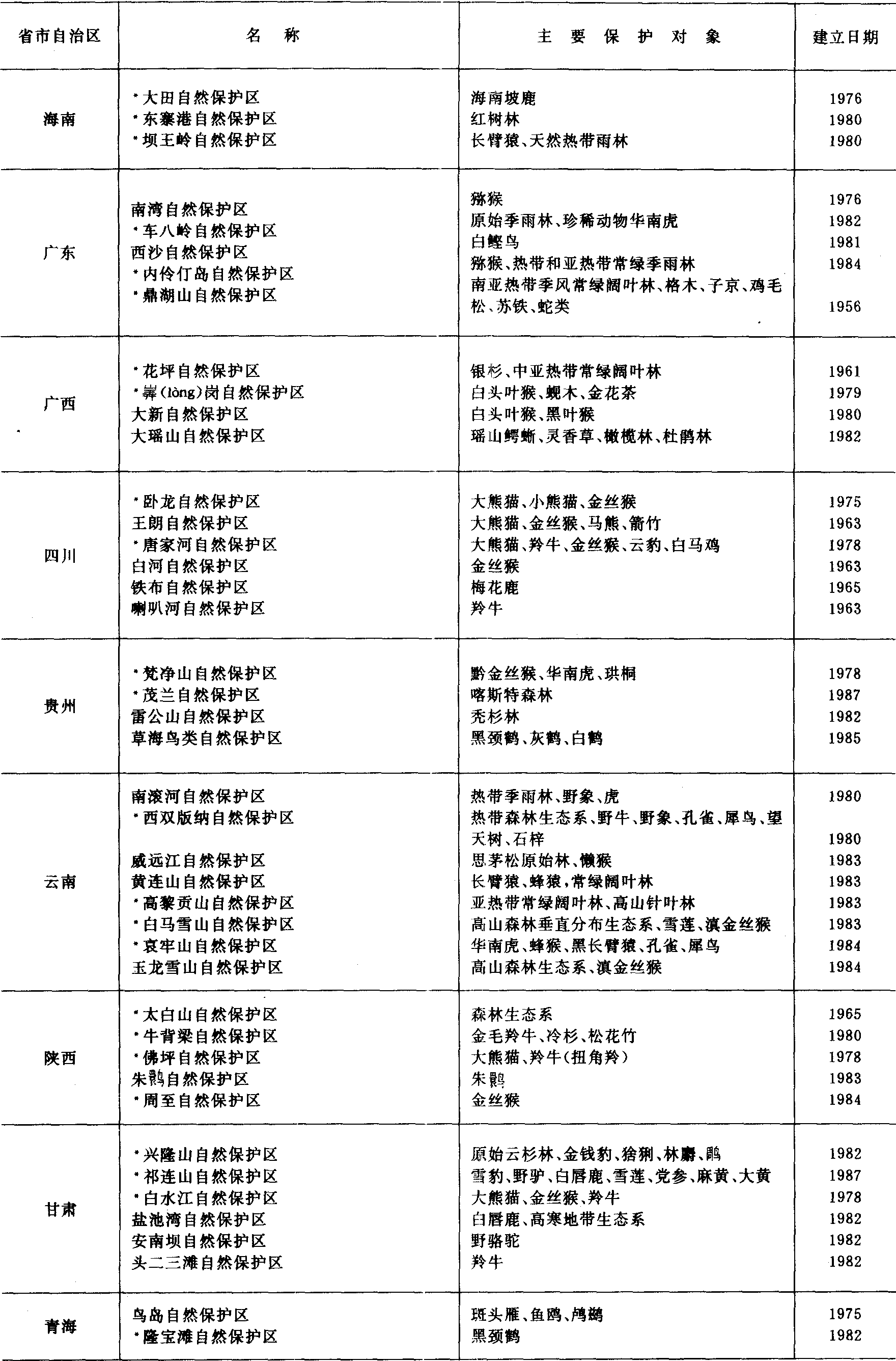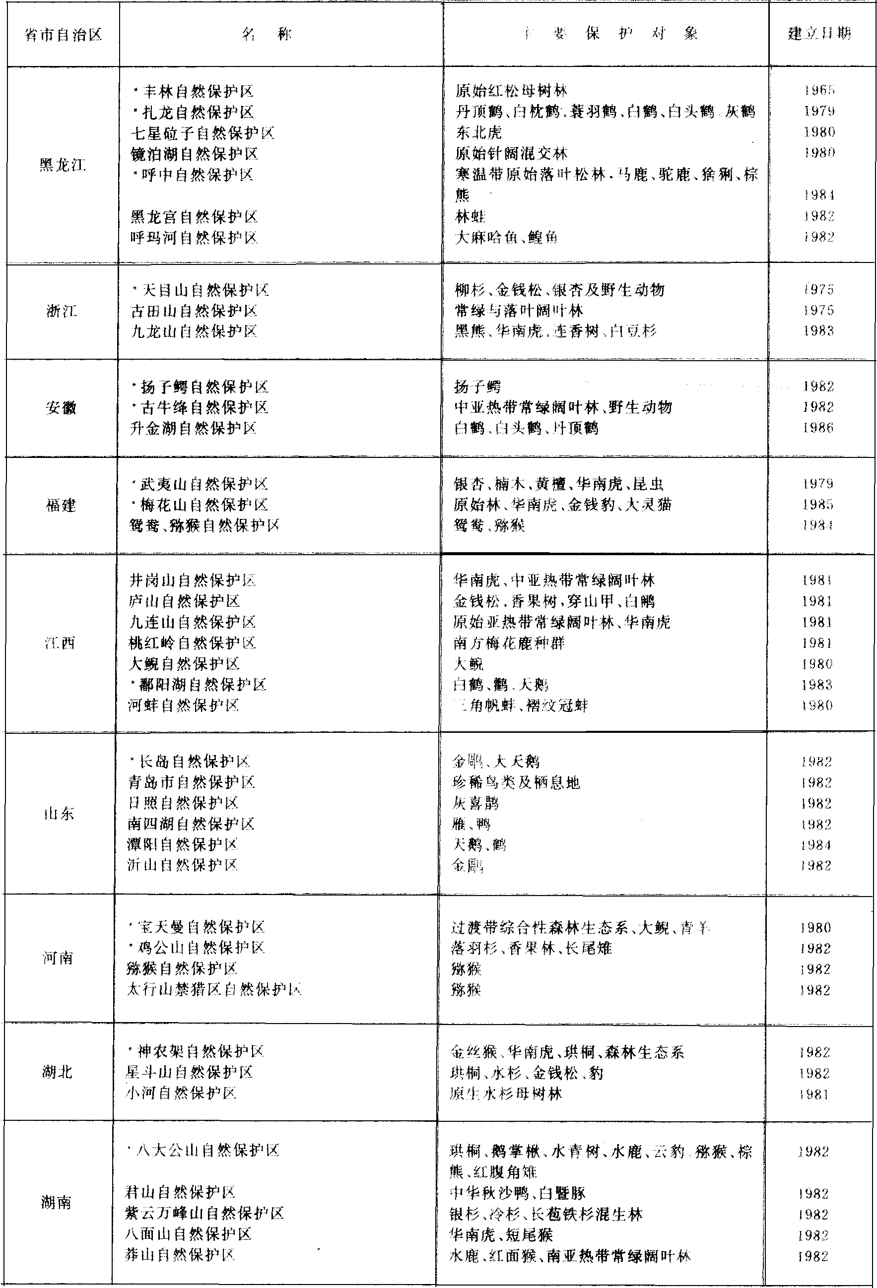 自然保护区natural reserve areas对包含保护对象在内的一定面积的陆地或水体进行特殊保护和管理的区域。保护对象主要包括: 有代表性的自然生态系统、珍稀濒危动植物的天然集中分布区,水源涵养区,有特殊意义的地质构造、地质剖面和化石产地等。 中 国 自 然 保 护 区(1986年)