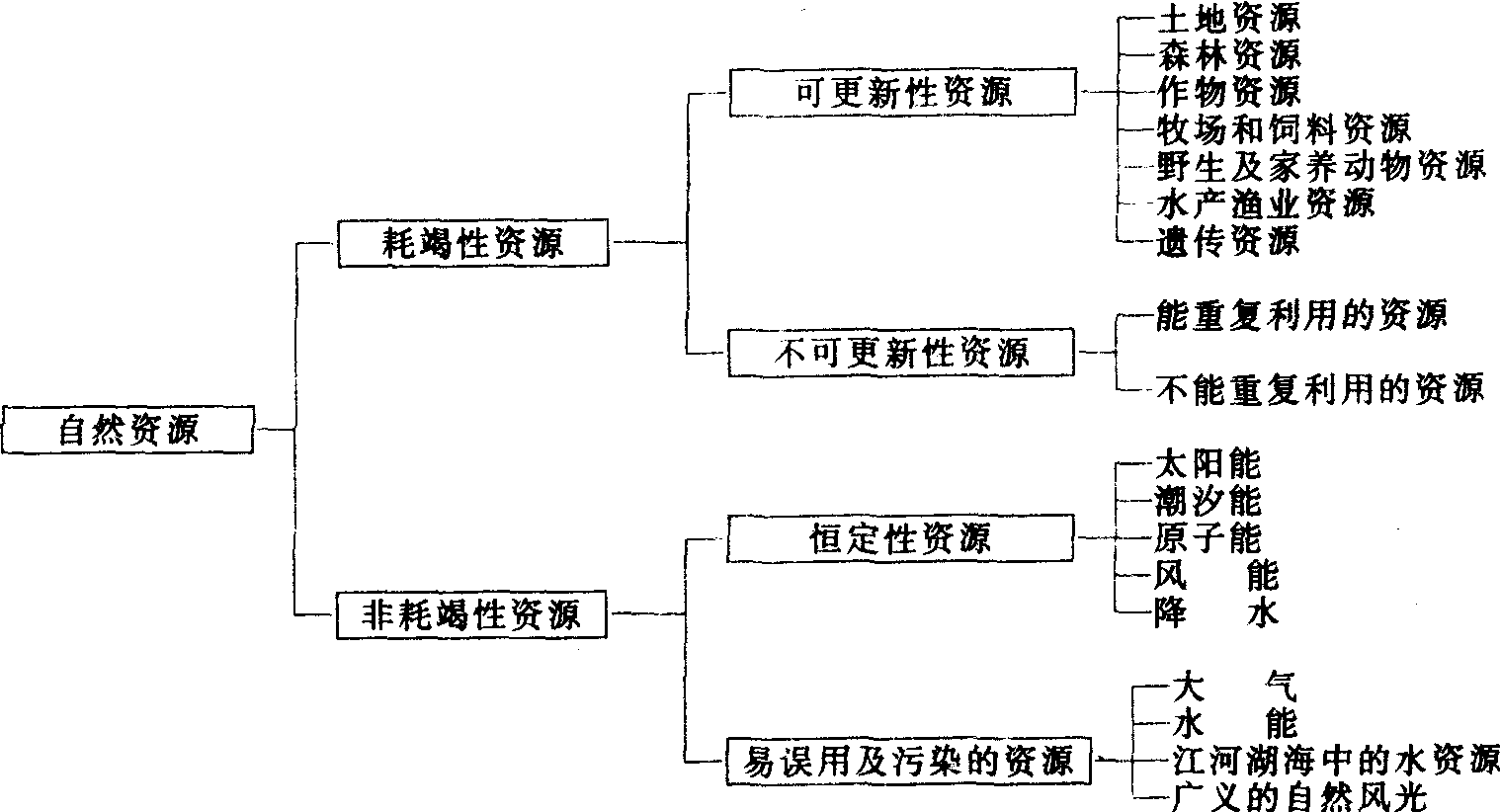 图中首先根据自然资源是否可能耗竭的特征分成耗竭性资源与非耗竭性资源两大类。耗竭性资源按其是否可以更新或再生,又分成可更新资源和不可更新资源两类: