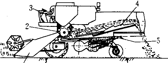 1.收割台 2.脱粒滚筒 3. 驾驶台 4.分离装置 5.清选装置