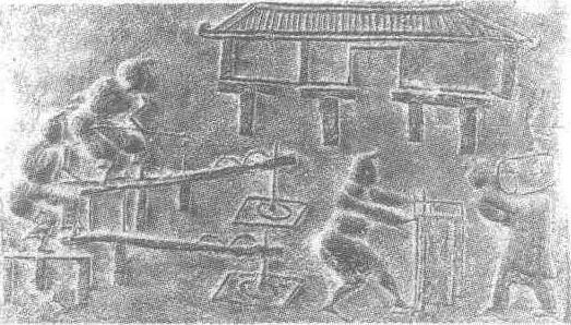 | 释义 | 舂米画像砖东汉。长47.6厘米,宽28.1厘米,厚6.2厘米。1955年四川省彭县出土。画面表现了汉代四川地区舂米的场面:在杆栏式四阿顶仓库前,二人并排而立,均一脚撑地,一脚踩木柄,在用杵碓舂米。左边两人,一个正将装满米的桶斜举至肩,向外倾倒,对面的人手持双扇摇着,作扬风除糠状,姿势十分生动。据考证,西汉末年已发明了装有轮叶的扬车,而从此画像砖反映的情况看,这种较先进的谷物加工工具至东汉时尚未在四川地区广泛应用。
