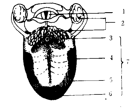 1.声带 2.扁桃体 3.苦味区4.酸味区 5.咸味区 6.甜味区 7.味觉区 舌的味觉感受区 舌苔为舌表面的苔垢,正常人舌表面无舌苔,当机体患有某些疾病时(如胃肠功能紊乱等),可出现较厚的舌苔。舌苔影响味觉的感受,患者常表现为食欲不振。 舌由横纹肌组成的肌性器官,具有味觉,协助完成语言、咀嚼、吞咽等生理功能,前2/3为舌体部,活动度大;后1/3为舌根部,活动度小,舌背粘膜有丝状乳头、菌状乳头(含味觉神经末稍)、轮廓乳头(含味蕾)。正常舌质呈淡红色,有白色薄苔,在患病时,舌质和苔均会发生变化。 舌位于口腔底部,是一个表面覆以粘膜的肌性器官。具有协助咀嚼、搅拌、吞咽食物、感受味觉和辅助发音等功能。它主要由舌内肌(纵肌、横肌和垂直肌)、舌外肌(颊舌肌、舌骨肌和基突舌肌)组成,表面被覆着舌粘膜,呈淡红色。舌分上、下两面。上面称舌背。舌背的界沟将其分为前2/3的舌体和后1/3的舌根。舌根固定于舌骨上,舌体前端狭窄称舌尖。舌体的粘膜上有许多小突起,称为舌乳头。其中丝状乳头数量最多,体积最小,几乎布满舌体;菌状乳头稍大,数量较少,散布于丝状乳头之间;叶状乳头主要分布于舌的外缘后部;轮廓乳头最大,位于界沟前方,共7~11个,乳头中央隆起,周围有环沟。轮廓乳头、菌状乳头、叶状乳头内含有味蕾。味蕾能感受酸、甜、苦、咸等味,故味蕾也称味觉感受器。舌根部的粘膜内有由淋巴组织形成的许多突起,称舌扁桃体。舌下面的正中线上有由粘膜形成的皱襞,称为舌系带。舌系带根部两侧的小粘膜隆起称为舌下阜,上面有舌下腺和下颌下腺的开口。舌下阜向后外侧的小粘膜皱襞叫舌下襞,其深面有舌下腺。中医理论认为,舌为心之苗,心气通于舌,心和则舌能知五味;舌还为脾之外候,脏腑经络多与舌有联系,故观察舌是中医诊断的重要方法之一。舌诊分为舌质和舌苔两方面。观察舌质的色泽、形态和舌苔的颜色、厚、薄、润、燥等,对诊断气血、阴阳、表里、寒热、虚实等病理变化有一定参考意义。舌质是指舌的本体,正常为淡红色。观察舌质的变化可辨别气血津液的盈亏、邪正的盛衰。若舌淡属气血虚;舌红为热;舌绛为热盛,见于外感热病,为热入营血。舌有紫斑为瘀血凝聚,舌体胖嫩或舌边有齿痕为阳气虚弱,舌体瘦为阴津不足或气阴两虚。舌苔是指生于舌面的一层苔状物。观察舌苔变化可辨别病邪的性质、深浅和脾胃等脏腑的功能是否正常。如薄苔主邪在表,厚苔主邪在里,苔厚腻为痰湿积滞,苔干燥为津液耗损,苔黄属热,苔黑而滑润属寒甚,黑而燥裂属热极等。 舌tongue ,lingua脊椎动物口腔底部的一个突起。有各种形态,功能也不同。一般鱼类的舌仅为基舌骨突出部分,外覆粘膜上的一个皮褶,不能活动,具触觉和味觉功能。四足动物一般具肌肉质舌,由舌体和舌基组成,能活动,除有触觉和味觉功能外,还可协调吞咽;蛙类的舌基附于下颌内缘,活动时,舌可向外翻转,用以捕捉小虫;蛇舌细长分叉;避役的舌特长,可充血“射出”,粘捕昆虫;鸟类的舌除鹦鹉外,均具角质鞘,取食花蜜的鸟类,舌呈吸管状或刷状;啄木鸟舌具倒钩,以钩食树洞中虫类。哺乳类的舌上具多种小突起(舌乳突),功能复杂,能舐取食物,协助吸吮和吞咽,具味觉、触觉等。 舌分舌尖、舌体和舌根3部分。舌有上、下两面,其后部可见∧形的界沟,将舌分为前2/3的舌体和后1/3的舌根。舌背上有许多小突起,称舌乳头,按形态分为4种:丝状乳头、菌状乳头、轮廓乳头、叶状乳头。轮廓乳头7~11个,排列于界沟前方。 |