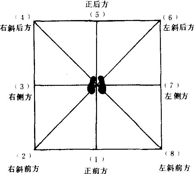 舞台动作的基本方向 舞台动作的基本方向Wutai dongzuo de jibenfangxiang表演者在舞台上(或场地上)做动作时常用的基本方向。以舞台的正前方为第一方向,也称“1点”,从第一方向开始,按顺时针方向转一圈的八分之一处为第二方向(即右斜前方),也称“2点”。以此类推,共分为八个方向(参见韵律体操“场地基本方位”图)。 |