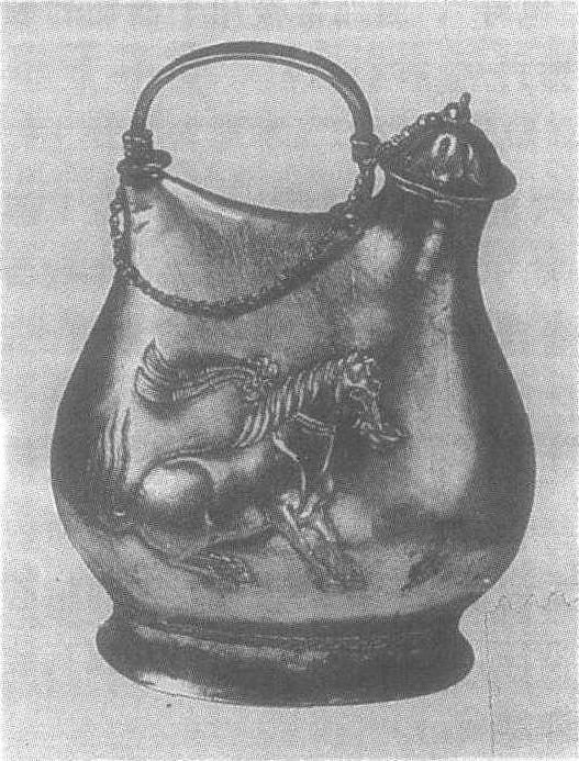 | 释义 | 舞马衔杯银壶唐代银雕。通高18.5、口径2.2厘米,此壶有鋬(pan),有流,流有盖,其盖以链与鋬连接; 鼓腹、圈足,腹部浮雕舞马,舞马衔环扬尾,前肢直撑,后肢作蹲跳状,饰缨飘飞,颇具动感。壶的造型、纹饰设计均独具匠心。《明皇杂录》载,唐玄宗李隆基曾于宫中驯养舞马四百蹄,“衣以文绣,络以金银,饰其鬃鬣,间杂珠玉”,每逢寿庆之日,必命衔环献舞。浮雕与记载相吻合,是其可贵的实物佐证。1970年出土于西安市南郊何家村窖藏,现藏陕西省博物馆。 舞马衔杯银壶唐。通高18.5厘米,口径2.2厘米。1970年陕西省西安市南郊何家村窖藏出土。陕西省博物馆藏。据《明皇杂录》记载,唐玄宗李隆基曾于宫中驯养舞马四百蹄,“衣以文绣,络以金银,饰其鬃鬣,间杂珠玉。”每逢他的生日,必命舞于兴庆宫之勤政楼下。这些经过训练的马,闻见乐声,即跳跃起舞,曲终衔杯跪伏,表示“祝寿”。这件实物的出土,证实了文献记载并非虚妄。此壶圈足内有墨书一行: “十三两半”。此器的造型和纹饰,均独具匠心,弥足珍贵。