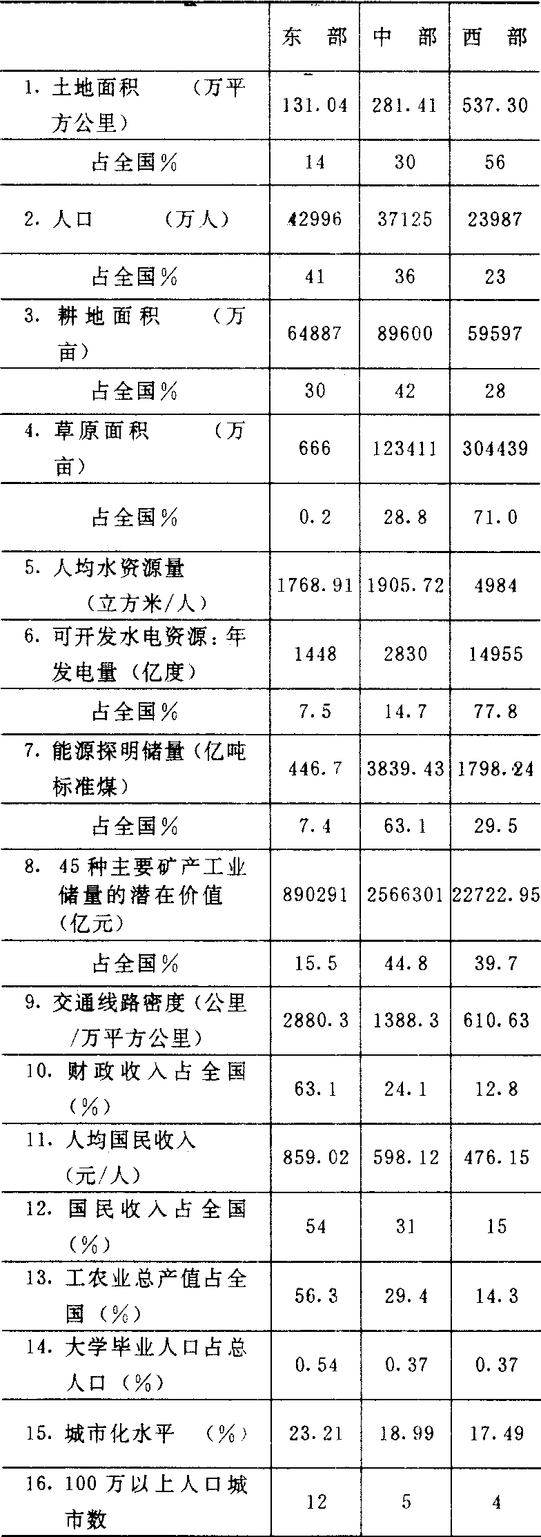 中部地带处于 “承东启西”的战略位置,资源十分丰富,矿产探明储量占全国重要地位的有煤、石油、铜、铝、铅、锌、钨、锑等多种矿产,水能和森林也很丰富;经过40年建设,很多工业部门,特别是原材料生产在全国占突出地位。本带应抓紧能源和原材料开发建设,发挥全国性的能源、原材料基地的作用;同时,应加快产业结构的调整,发展加工工业,提高产业关联度和加工能力,以增强经济效益、提高经济活力,努力改变产品初级化、产业结构低效的局面。 西部地带地域广阔,能源、矿产等后备资源丰富,发展潜力大; 其限制性因素是经济技术水平较低,生产力水平落后,交通不便,科技文化水平较低。当前,应充分利用东部地区面临能源、原材料短缺的矛盾和东部、中部产业结构调整的时机,立足丰富的资源,迅速开发资源组合好的地区,并发展有原料优势的加工工业,如耗能高的部门和有地区特色的轻纺工业。 |