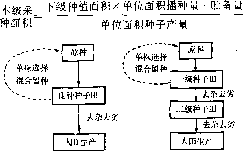 生产用种繁殖 以原种为播种材料,提供生产用种的种子繁殖过程。凡繁殖系数高而又易于天然杂交的蔬菜,一般采用良种种子田繁育制。对于繁殖系数较低的自花授粉蔬菜,必须增加繁殖代数,方能得到足够的种子量,故一般采用良种等级(2~3级)种子田繁殖(见图)。各级繁殖田的面积大小,按下列公式计算: