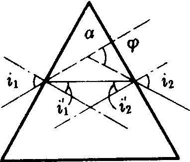 | 释义 | 色散率sesanlu表示色散系统和媒质色散性能的物理量。又称色散本领。色散系统与媒质表示色散率的方法是不同的,色散系统(如棱镜、光栅等)的色散率用角色散或线色散量度。❶角色散是入射光中两种波长不同的光线通过系统后,它们偏向角之差与波长差的比值,单位一般用角分/0.1纳米。三棱镜的角色散dᵠ/dλ=sinα/cosi1'·cosi2'·dn/dλ,各量的意义如图。最小偏向条件下的角色散