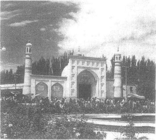 艾提卡尔清真寺中国伊斯兰教清真寺。位于新疆维吾尔自治区喀什市解放路艾提卡尔广场。艾提卡尔,维吾尔语音译,意为节日场所。相传始建于明正统七年 (1442),清代又经多次重修和扩建,初步形成了当今的规模。占地约16000多平方米,由礼拜寺和经学院两部分组成。经学院、沐浴室、宿舍在西部。东部有12米高的尖拱型门楼,边廊环以穹形壁龛。门楼左右为高18米的圆柱形砖砌宣礼塔,门楼与塔以短墙相连,构成一个整体。礼拜殿宽160米,进深16米,分内外两殿,殿顶由158根绿色雕花木柱承重,顶棚绘有彩色花卉的藻井,令人目不暇接。该殿可同时容纳6000余名穆斯林作礼拜,是国内现存最大的伊斯兰教礼拜殿。 艾提卡尔清真寺即“艾提尕清真寺”。 |