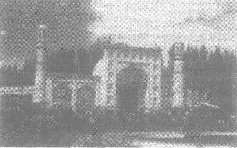艾提尕清真寺位于市中心的艾提尕广场。新疆规模最大的清真寺。相传始建于清嘉庆三年(1798)。道光十八年(1838)扩建。占地15亩,平面呈长方形。高大的寺门两侧,各有一座高十余米的塔楼,与寺门以短墙相接。绿色大门里,是八角形门厅。厅上有白色拱顶,与两座塔楼的铁制月牙塔尖,成三足鼎立之势。门厅后的庭院内,松柏苍劲,白杨参天。中心建筑礼拜殿,分为内外两殿,全长160米,进深16米,内有140根绿色雕花木柱。寺内可同时容纳六、七千名穆斯林做礼拜。喀什是古丝绸之路重要城市,“迢遥疏勒峙边雄,据水凭山物产丰”。艾提尕清真寺则以历史悠久,富丽宏大而名闻中外,成为喀什古城的特征。每逢开斋节和古尔邦节,成千上万的穆斯林接踵来此礼拜。艾提尕广场成了各族人民的欢乐海洋。 艾提尕清真寺一作“艾提卡尔清真寺”。我国现存最大的清真寺。“艾提尕”是阿拉伯语与波斯语复合词,意为节日礼拜场所。在新疆喀什市解放路。传称始建于回历846年(公元1426年),迭经重修扩建。大寺南北长140米,东西宽120米,占地共约15亩。礼拜殿可同时容纳8000名穆斯林作礼拜。大寺正门为浅绿色,满布精细刻花。砖红色门楼高12米,边廓环以穹形壁龛。门墙左右各矗立一座高达18米的圆柱形砖砌尖塔。全寺由礼拜寺和教经堂两部分组成。礼拜殿内有140根绿色雕花木柱,成网状格排列,支撑白色密肋顶棚。顶棚上有许多绘有花卉图案的藻井。属阿拉伯式建筑,具有典型的伊斯兰艺术风格。艾提尕清真寺是喀什地区宗教礼拜中心,新疆伊斯兰教最高学府。是古尔邦节、肉孜节群众歌舞游乐的主要场所。 艾提尕清真寺一作“艾提卡尔清真寺”。我国现存最大的清真寺。在新疆喀什市。相传始建于明景泰(1450—1456)年间,后曾多次扩建,至清道光十八年(1838)始初具今日规模。属阿拉伯式建筑。共占地约十五亩。礼拜殿全长一百六十米,进深十六米,可同时容纳八千名穆斯林作礼拜。殿内有一百四十根绿色雕花木柱,成网格状排列,支撑白色的密肋顶棚。顶棚上有许多绘有各种花卉图案的藻井。建筑工艺精细,布局严整,具有浓厚的伊斯兰艺术风格。为喀什地区宗教礼拜的中心,也是新疆伊斯兰教的最高学府。 艾提尕清真寺位于新疆喀什市。初建于明景泰年间(1450~1456),几经扩建至1838年才形成现在的寺院。总面积约16800m2。寺门两侧屹立着两座10多m高的塔楼。礼拜殿全长160m,进深16m,有140根绿色雕花木柱,支撑着白色的密肋顶,可同时容纳6000多人做礼拜。是新疆地区最大的清真寺。 |