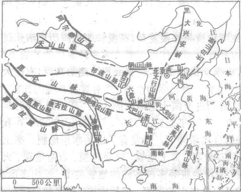 | 释义 | 中国的山脉Zhongguo de shanmai我国是一个多山的国家,不仅山地面积广大,许多大山千姿百态,雄伟壮丽,而且大小山脉纵横全国。它们的分布具有明显的方向性,大致以东西走向和东北—西南走向为多,西北—东南走向和南北走向的较少。东西走向的山脉主要有三列,是由许多山脉组合而成的带状山系。最北一列是天山—阴山,大致分布在北纬40°30′—42°30′之间;中间的一列是昆仑山—秦岭,大致位于北纬32°30′—34°30′之间;最南的一列是南岭,它的主体大致位于北纬24°—25°30′之间。这三道纬向走向的山带,实际上已成为我国的三条重要的地理界线,它们对我国的气候、水文以及农业生产等各方面都有较大的影响。东北—西南走向的山脉多分布在我国的东部,由几乎是三列互相平行的带状山岭组成:最东面的是台湾山脉;中间的一列是长白山、武夷山等;最西面的一列是大兴安岭—太行山—巫山—雪峰山等。由于它们的位置正处于与我国盛行的东南季风呈直角相交,这就加强了我国东部湿润和西部干旱的气候特征。这种明显的作用,尤以大兴安岭最为典型,大兴安岭以东河流的侵蚀作用占优势,大兴安岭以西干燥剥蚀作用占重要地位。这些山脉同东西走向的山脉互相交织,构成了网格状的排列,增加了我国地形的复杂性。西北—东南走向的山脉,主要分布在我国的西部地区,自北而南有阿尔泰山、祁连山、喀喇昆仑山、冈底斯山、喜马拉雅山等。昆仑山以南的高大山地,喀喇昆仑山、冈底斯山、喜马拉雅山等,在西段表现为西北—东南走向,向东则逐渐转为东西走向,呈现出向南突出的弧形。它们巍峨地耸立在青藏高原之上,形成世界上最为雄伟高峻的山脉带。据研究认为,这一高大山带的形成,主要是由于印度次大陆那样大的大陆地壳部分已经嵌入亚洲大陆,并且不断地沿着大陆的基底滑动,使青藏高原逐步抬升,并显然地具有两个大陆的厚度,成为世界上最高的大高原。南北走向的山脉多位于我国的中部,自北而南有贺兰山、六盘山、横断山脉等。横断山脉是由许多岭谷相间的高山和深谷所组成,包括邛崃山、大雪山、沙鲁里山、宁静山、怒山、高黎贡山等山脉及大渡河、雅砻江、金沙江、澜沧江、怒江等谷地。这一系列南北走向的山脉,把全国分为东、西两大部分,西部山地以西北—东南走向为主,山势高峻,多为3 500米以上的高山和>5 000米的极高山;东部山地以东北—西南走向为主,多为海拔2 000米以下的中山、低山。这几种走向的山脉相互交织呈网格状分布,其间是地势相对低洼的高原、盆地和平原等地区。