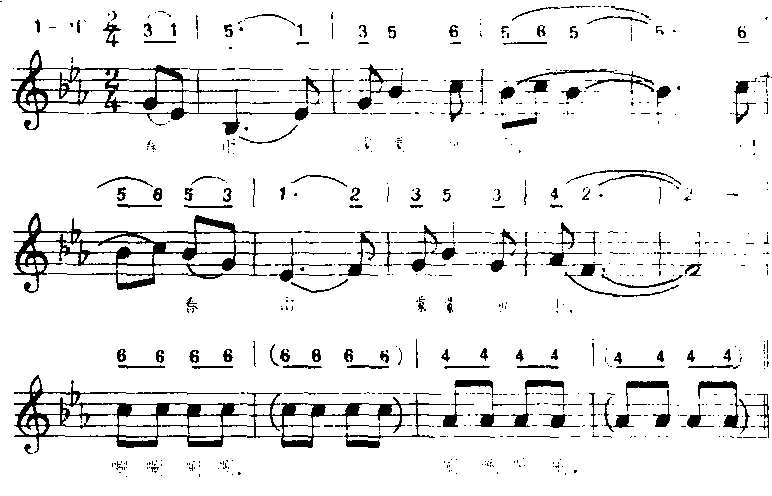 这是从自然界鸟的叫声中提炼出来的。 ❹《银色的马车从天上来啦》(蒋雄达曲):