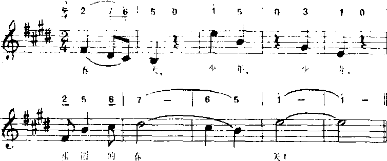 ❷《歌唱吧,中国的少年》(苏克曲),“我们”两字用了同一小节的一强拍和 一弱拍,很天真活泼: