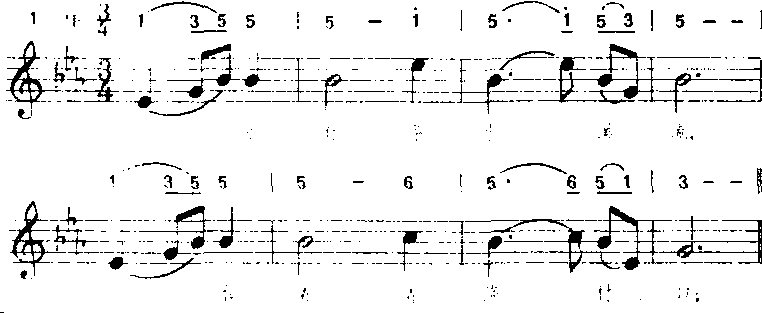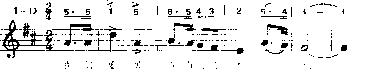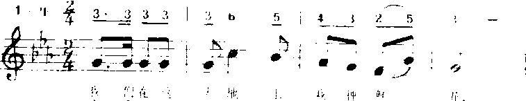 ❼《我们和你们》(瞿希贤曲),用在三拍子的前两拍,而“们”字用八分音符,第二拍的后半拍和第三拍休止,那种自豪而热情的神态表现得淋漓尽致: