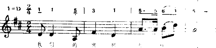 这样就不如原旋律自然、流畅,而变得拗口、难唱。原因就在于它破坏了语言节奏,歌词中的逻辑重音被颠倒了。从上面的例子可见,正确地处理好节奏和语言的关系是十分重要的,否则,难唱、难记或听不懂歌词。所以,在谱曲前,要反复朗读歌词。除分析和理解歌词的主题思想和意境外,在创作准确而生动的音乐形象时,要特别注意到语言的节奏。这样,歌曲的内容会更准确、鲜明地表达出来。为达此目的,需注意下而几个问题:❶一个词汇的重音,要摆在曲调的强拍或某一拍的强音(前半拍音)上。 ❷歌词中重要的词应摆在强拍或强音上。 ❸动词要摆在强拍或强音上。以上三点只是歌词节奏处理的一般规律,而在为歌词谱曲时,往往要考虑歌曲节奏的典型表现和整个歌曲节奏的完整性。所以,同样一个词汇,根据内容表现的不同要求而可以处理成各种不同的节奏。如:“我们”这个词就可处理成如下几种节奏一❶《中国少年先锋队队歌》 (寄明曲),“我们”两个字都放在强拍上,很有气势: