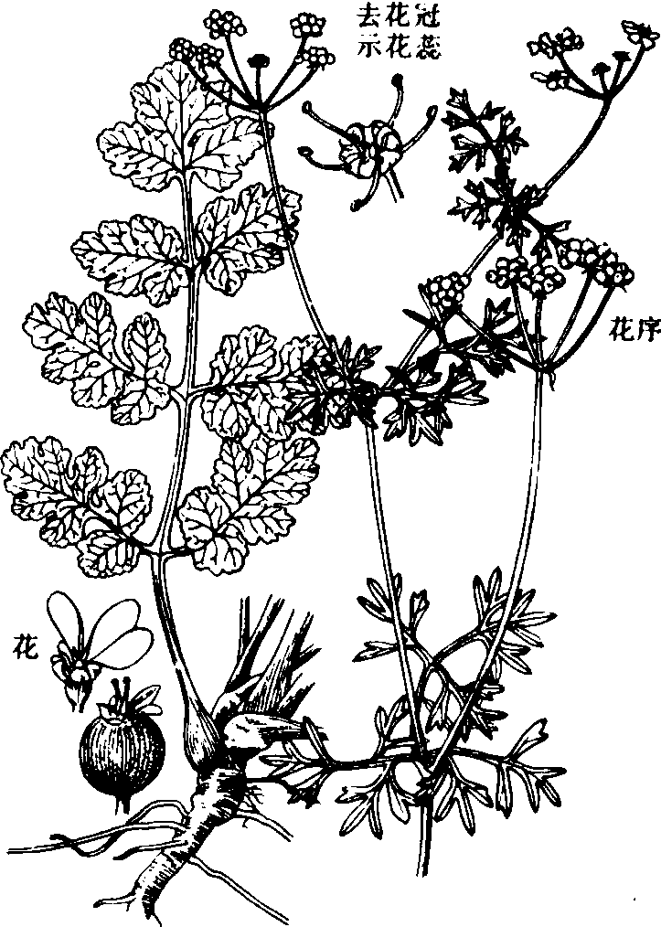 | 释义 | 芫荽coriander夏季蜜源植物。学名Coriandrum sativum L。别名香菜、胡荽、香荽。伞形科,芫荽属。一年生或二年生草本植物。高30~100厘米,植株具强烈香气,基生叶一至二回羽状全裂,茎生叶三至多回羽状深裂。伞形花序,顶生,每一小伞形花序有可孕花3~9朵,花白色或淡紫红色,有花瓣5片,雄蕊5个。双悬果近球形。(见图)