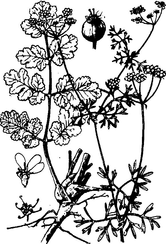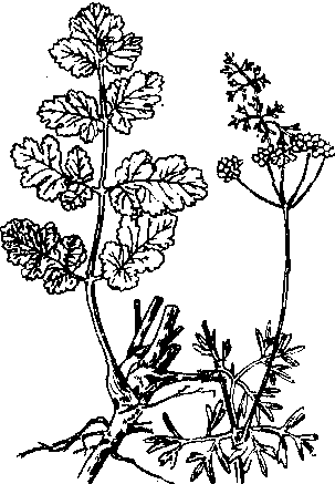 芫荽 芫荽别名香菜、胡荽、香荽。全疆均有栽培。具有散寒理气、发汗透疹、开胃消食的功能。药用全草及果实,主治麻疹不透、胃寒作痛、胆道蛔虫等病症。杀虫植物,对蚜虫有效。 芫荽伞形科一年生草本植物。又称香菜。株高30~100 cm,全株具强烈香气。直根。茎直立。基生叶1~2回羽状全裂。茎生叶2~3回羽状深裂,最终裂片狭条形。伞形花序顶生或与叶对生,伞幅2~8 cm。花小,白色或淡紫色。果近球形,直径1.5 mm,有香气。花期4~5月,果期6~7月。原产意大利。中国自古栽培,茎叶作蔬菜和调味香料。耐寒,生长期短。春、秋均可播种。大面积生产栽培,华北各地8月播种为适期,江南10~11月为适期。北方入冬后畦面防寒,早春上市。芫荽种子含芳香油0.4%~1%。蒸油后的种子还可榨取17%~21%的脂肪油。油粕蛋白可作饲料。 |