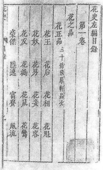 图2 万历刻本·目录 《花史左编》On Plants and Flowers明代花卉专著。王路撰。路字仲遵,号澹云,又号太原是岸生,浙江嘉兴人。作者对花卉栽培怀有浓厚兴趣,平时种花栽竹,并辑录有关花木名品、种植技术与典故。书成于1617年,全书共24卷。分花之品、花之寄、花之名、花之辨、花之候、花之瑞、花之妖、花之宜、花之情、花之味、花之荣、花之辱等。本书虽为文人遣兴之作,但在各卷中仍能见到有关花卉栽培的重要资料与种植花卉的宝贵经验。作者曾编《花之辞翰》12卷为右编。 花史左编二十七卷。明王路撰。王路,字仲遵,嘉兴(今浙江嘉兴市)人。生卒年及事迹均不详。著作有《花史左编》。是书的主要内容为记载花之品目及其故事。全书分类编辑,遣词造句轻佻、戏谑,不脱明末小品之习。据《浙江通志》记载,王路《花史》二十四卷,有天启元年(1621)李日华序。《四库全书总目提要》编撰时,此书流传本为二十七卷。书前没有李氏序言,而有陈继儒序言一篇与王氏自作小引,皆称是书二十四卷。又,此本二十五卷花之友、二十七卷花之器,皆题潭云宣猷驭云子补。二十二卷花尘,题百花主人辑。由此看来,王氏之书原本二十四卷,二十二、二十五、二十七三卷,为后人所补入。又,王氏小引称此书为“左编”,别有“右编”为《花之辞翰》,约为十二卷,有其名而未见其书。《四库全书总目提要》据江苏巡抚采进本列为存目。 |