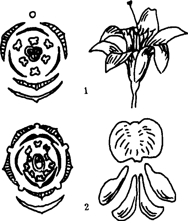 | 释义 | 花图式huatushi用花的横剖面简图表示花各部分的数目、离合情况,以及在花托上的排列位置的图式。花图式也是花的各部分在垂直于花轴平面所作的投影图。以百合和蚕豆为例说明。图中中空的弧线表示苞片,实心弧线表示花冠,带横条的弧线表示花萼;雄蕊和雌蕊以它们的横切面图表示。图中也可以看到联合或分离,整齐或不整齐的排列情况。
