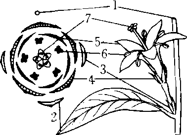 花图式 1. 花轴 2. 苞片 3. 小苞片4. 萼片 5. 花瓣 6. 雄蕊 7.雌蕊 |