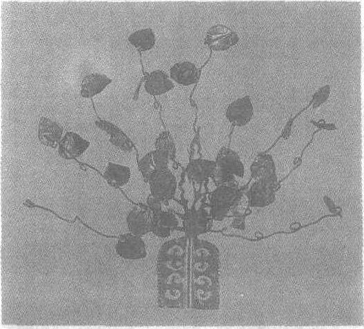 | 释义 | 花树状金冠饰晋。通高28厘米。1957年辽宁省北票县房身2号墓出土。辽宁省博物馆藏。此器为冠饰,如一株枝叶繁茂的花树。基部突起一脊,两侧为镂孔云纹,四周边布满针孔。其上为短而宽的树干,分出三主枝,又共出16分枝,枝身缠绕为环,上穿桃形金叶,随风摇颤,琤琤作响。此饰用法当与冯素弗墓金冠饰相同。共出两件,此其大者。