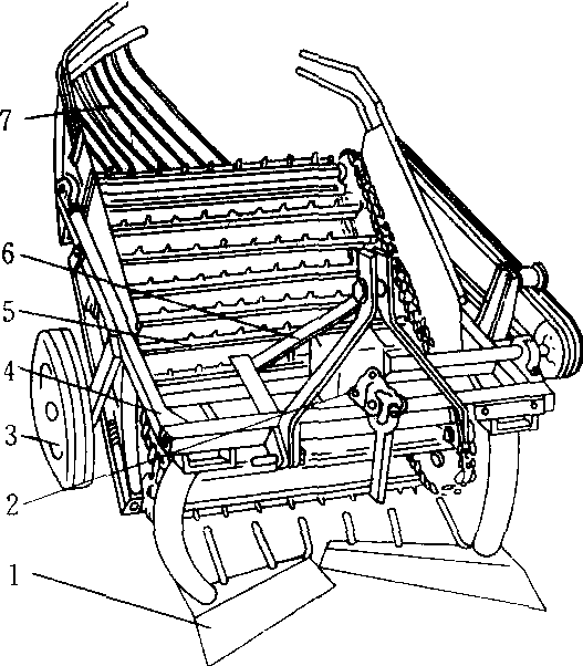 挖掘捡拾抖动型花生挖掘机 1.挖掘铲 2. 变速箱 3. 地轮 4. 机架 5. 升运链分离机构 6. 悬挂装置 7. 铺放滑条 花生收获机械用于花生的挖果、分离泥土、摘果、清选等过程的收获机具。20世纪40年代美国研制出花生分离—集条机,50~60年代研制出挖掘—翻转集条机。中国于50年代开始研究,60年代研制出摘果机、70年代研制出花生挖掘机,80年代初研制出花生联合收获机。有分段收获机械和联合收获机械2大类。主要有摘果机、挖掘机和联合收获机3种类型。 |