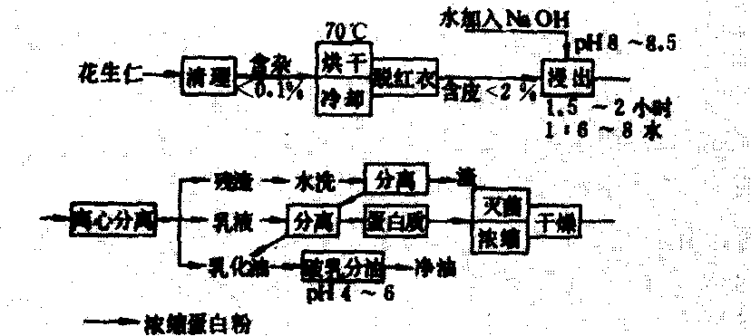 水浸法制取浓缩蛋白粉的工艺流程 精炼工艺 花生油属不干性油,色泽浅、香味浓郁。脂肪酸组成中的饱和酸含量较高,冬天易呈半冻状态。一般毛油的酸价较低(1~3),磷脂含量较少(0.3%~1.0%),但有可能存在黄曲霉毒素,须考虑采取脱毒措施,如加热法、吸附法、紫外线照射法、臭氧处理法等,或采用碱炼、脱色工序结合方法进行去毒。普通食用油(即二级油)一般只需水化脱胶(可以在浸出车间进行),而高级烹调油或一级油需碱炼、脱色与脱臭。花生色拉油的脱脂工序,限于用冷冻法。 饼粕利用 饼粕的蛋白质含量高达50%,还有少量脂肪。经液压压榨机、低温浸出及水剂法生产的饼粕和花生粉,可作为多种食用蛋白,如半脱脂花生粉、脱脂花生粉、花生乳制品、浓缩蛋白粉、分离蛋白粉和组织蛋白及各种复合食品的原料。花生饼粕的含氮量高于菜籽饼、大豆饼、棉籽饼、亚麻籽饼,亦可用作蛋白饲料和肥料。 |