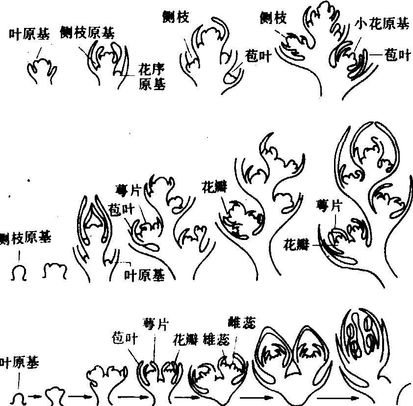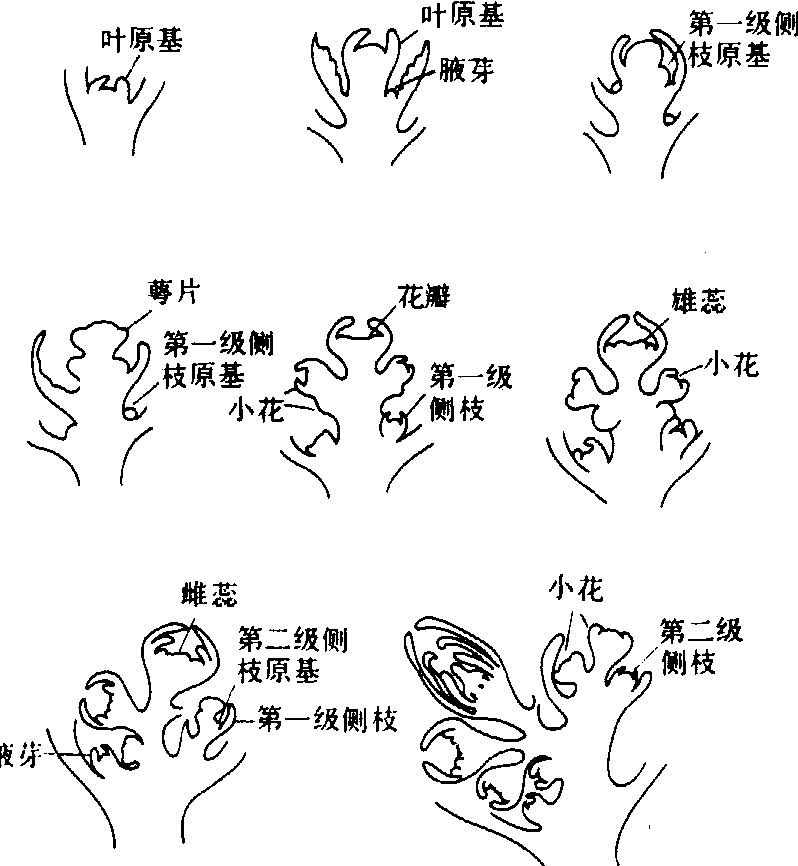 图 2 蔓生菜豆花芽分化过程示意图 化为花芽,有番茄、茄子、辣椒、大葱、大蒜、洋葱、韭菜等(图1);❷腋芽分化为花芽,有瓜类、蔓生豆类、蕹菜、落葵、草石蚕等(图2); ❸顶芽和腋芽均可分化为花芽。按二者分化的顺序又有两种情况: 一种是苗端叶原基的腋芽先分化为侧花茎原基,然后顶芽分化为主花茎上的小花,如白菜、芥菜、芜菁、甘蓝、萝卜、莴苣、菠菜、叶菾菜、苋菜(图3); 另一种是顶芽