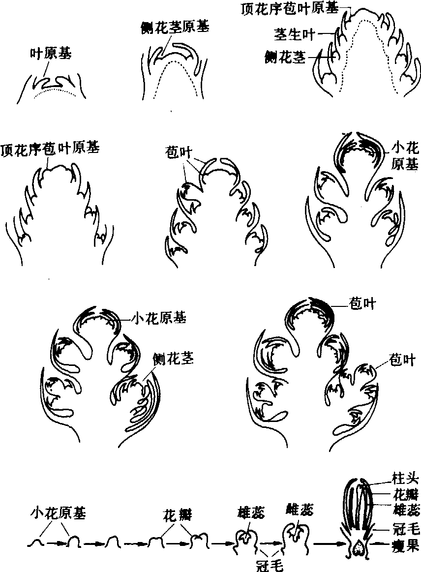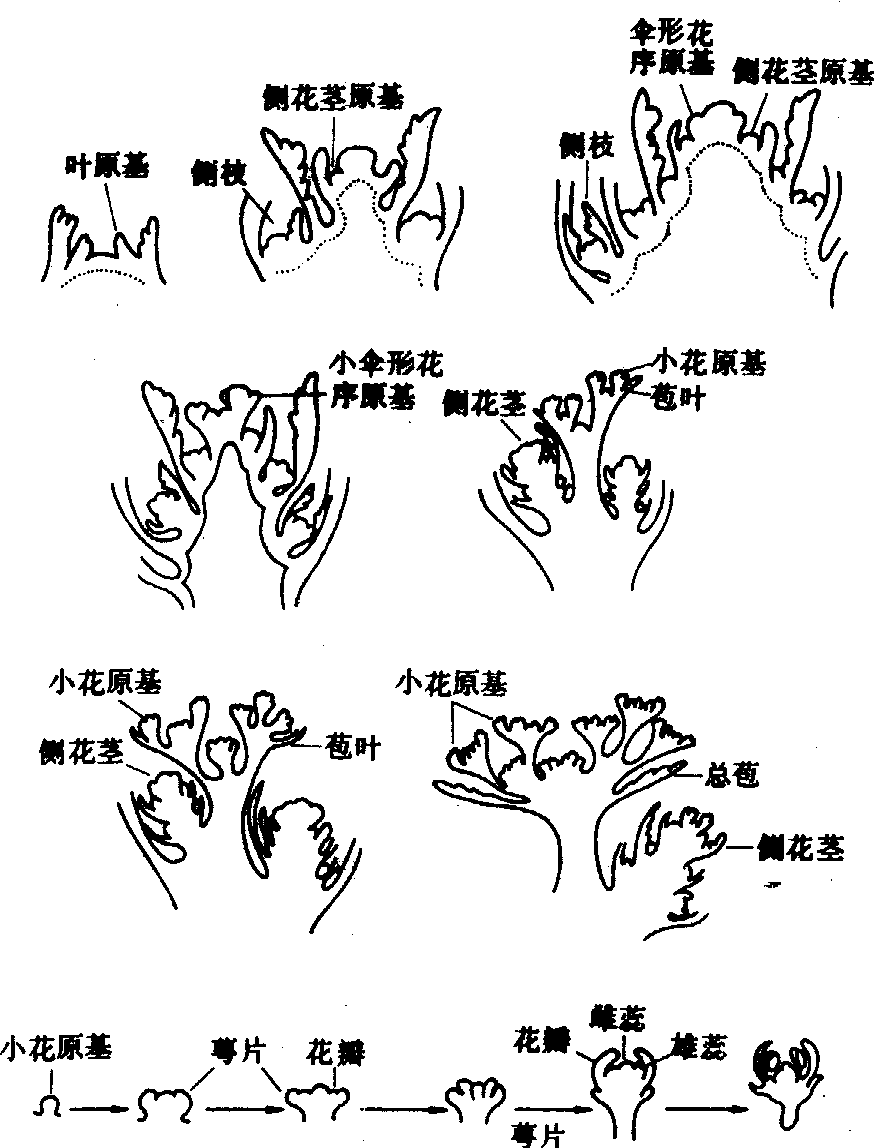 图3 莴苣(包括莴笋)花芽分化过程示意图 先分化为顶花序原基,下方腋芽相继分化为侧花茎原基,如芹菜、芫荽、筒蒿、茴香、苦苣(图4)。影响花芽分化的因素: ❶温度: 低温促进花芽分化的蔬菜有白菜类、甘蓝类、葱蒜类、萝卜、芜菁、胡萝卜、芹菜、芥菜等; 高温促进花芽分化的蔬菜有莴苣。温度感应部位在植株生长点的幼细胞和催芽种子的胚。 ❷日照:长日照促进花芽分化的蔬菜有白菜类、甘蓝类、菠菜、芥菜、筒蒿、豌豆、蚕豆、萝卜、胡萝卜、芜菁等; 短日照促进花芽分化的有紫苏、苋菜、大豆、甜玉米等; 日照长短对花芽分化影响不大的有番茄、茄子、辣椒、菜豆和早熟大豆等。日照感应部位在叶片。完全展开的成熟叶对日照刺激的感应最敏感,老叶和未成熟嫩叶不敏感。 ❸营养元素的丰、缺及二氧化碳浓度也对花芽分化有影响。人为调节温度、日照、营养元素及二氧化碳浓度等,可抑制或促进花芽分化,调节花期,并应用于蔬菜的促成栽培或延后栽培。植物生长调节剂也有控制花芽分化的作用。生长素类的吲哚乙酸(I AA)、萘乙酸(NAA)、2,4滴(2.4-D)等,在花芽分化前施用会延迟花芽分化。抗生长素类,如三碘苯甲酸(T I BA)、青鲜素(MH)、矮壮素(CCC)、比久(B9)、硫酸烟碱等,在花芽分化前施用,可降低植物体内植物生长素含量,促进花芽分化。赤霉素可抑制短日照植物的花芽分化,促进长日照及低温感应性植物的花芽分化。矮壮素(CCC)、乙烯利(ethrel)有促进瓜类雌花形成、抑制雄花形成的作用,而赤霉素的作用则相反。