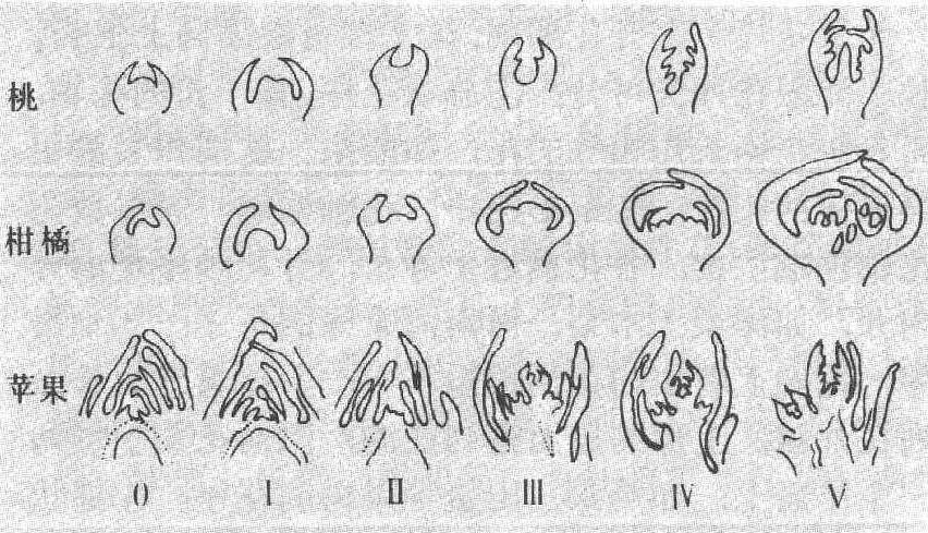 图 1 果树花芽分化过程模式 苹果和梨的花芽形态分化过程和形态变化共分5个时期(图1、2)。❶分化始(初)期(花序分化期)。分化开始, 生长点变宽, 突起, 呈半圆形, 而后生长点两侧出现尖细的突起, 此突起为叶或苞片原基。再进一步分化, 在苞片腋间出现突起, 此为侧花原基; 原中心的生长点成为花序中心花的原基。 ❷萼片分化期。花原基经过伸长、增大, 在周围出现突起, 此突起为花萼原基。 ❸花瓣分化期。在花萼内侧基部出现突起,此为花瓣原基。 ❹雄蕊分化期。在萼片内侧花瓣之下出现突起,此为雄蕊原基。 ❺雌蕊分化期。继雄蕊分化之后,在中心处出现突起,此为雌蕊的心皮原基。此后,心皮经过伸长、合拢, 形成心室、胚珠而完成雌蕊的发育, 与此同时雄蕊完成花药、花粉的发育; 花的其它器官如花萼、花瓣也同步发育。 162