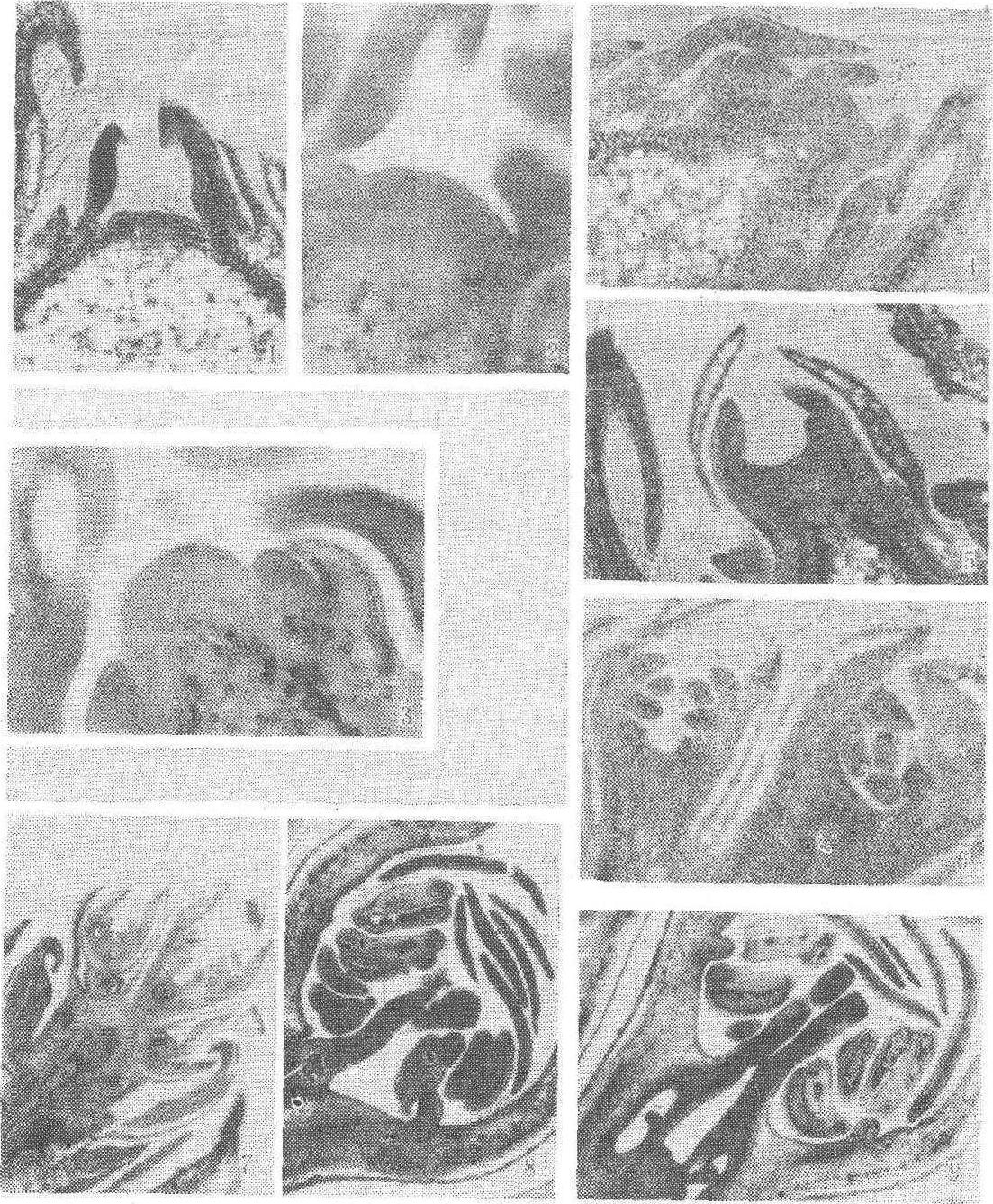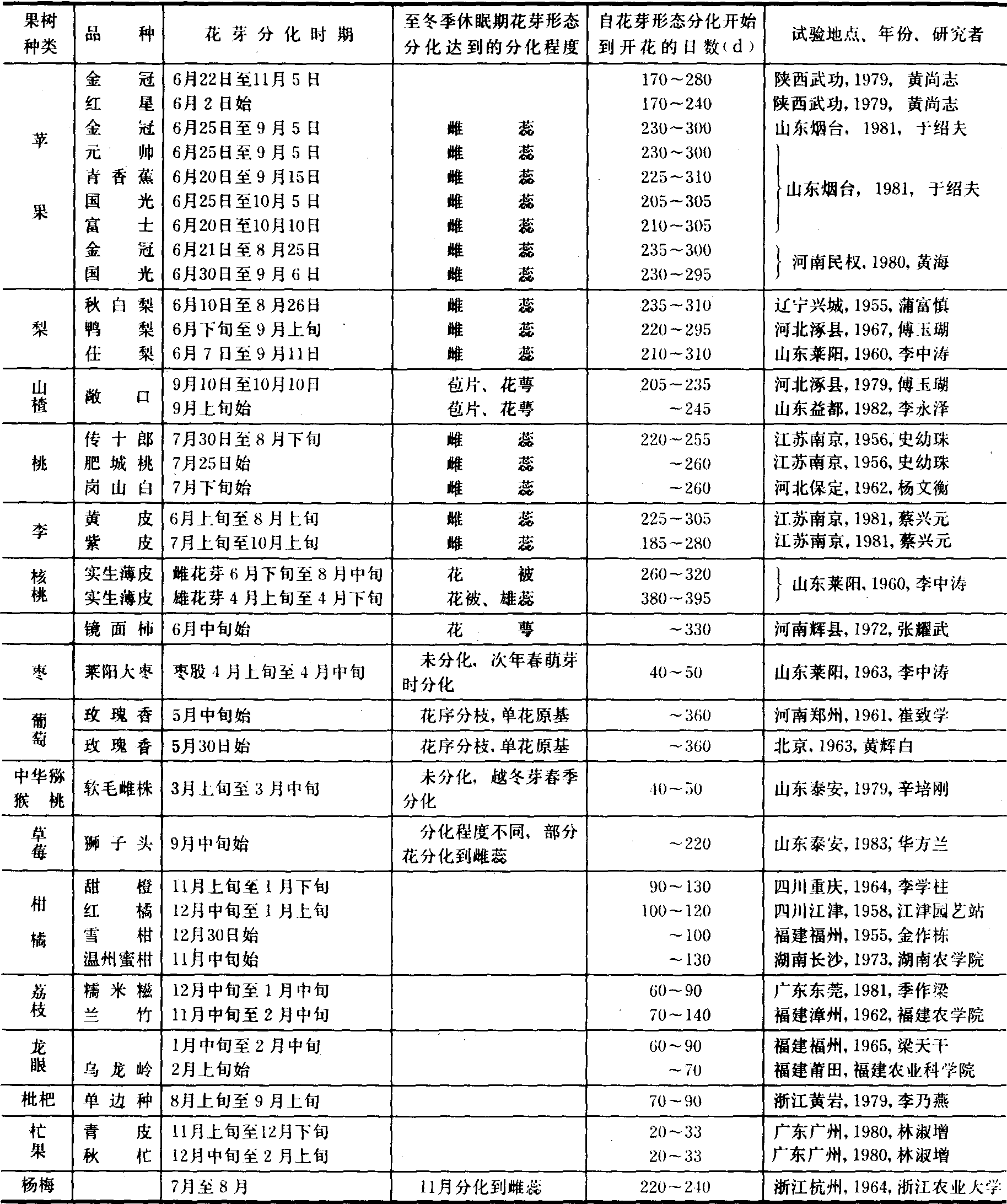 图 2 苹果花芽分化过程 花芽一旦开始形态分化之后, 特别是到萼片分化期之后, 不能逆转为叶芽。但是内外条件恶化, 则能影响花芽内的花蕾数和质量。 花芽分化时期 即芽能够分化为花芽的时期。果树生产上既注意芽最早分化花芽的时期, 也注意最早与最迟分化花芽所持续的时期。花芽分化时期, 因树种、品种而异, 决定于果树的特性及枝芽和芽发生的早晚。如苹果的短枝顶芽在5月下旬分化花芽、而长枝的腋花芽要延迟到9月才开始分化花芽。枣、葡萄、四季橘、金柑等一年多次发枝, 而花芽可以多次分化,但各种果树花芽分化有相对的集中期, 苹果、梨一般在6月至9月;桃7月至9月; 柑橘11月至翌年1月;葡萄5月至8月, 枣则在4月。 菠萝、香蕉, 花芽分化时期决定于植株长成叶数的多少, 菠萝的卡因种在具有30~40片叶时分化花序; 高把香蕉在广东省一般在抽生20~24片大叶时分化花序。 同一树种和品种花芽分化的早晚受多种因素影响。成年树比幼树分化早; 中等健壮树比徒长树分化早; 结果少的树比结果多的树分化早; 花芽分化阶段气候相对干旱比降雨多的年份分化早。 花芽形成时期和速度 不同种类的果树,花芽形成的时期和速度不同(表1)。落叶果树因受冬季休眠期的影响, 大部分树种是第一年分化花芽, 经过冬季休眠, 第二年春季萌发开花; 少数树种是当年分化花芽, 当年萌发开花。落叶果树根据冬季休眠前是否分化花芽和花芽形态分化达到的程度, 分为三种类型。❶第一年花芽形态分化, 到冬季休眠时一般能达到雌蕊分化期的程度, 如苹果、梨、核果类果树。其中桃、杏雄蕊可出现花粉母细胞, 雌蕊有的可出现胚珠原基。第二年春花器官继续发育,形成花粉和胚珠,并萌发开花。 ❷第一年花芽形态分化, 到冬季休眠时, 达不到雌蕊分化期的程度。山楂分化到花萼分化期; 核桃雌花分化到萼片期; 柿分化到花萼或花瓣分化期; 葡萄分化到花序分枝或花原基。 ❸越冬芽在春季萌动和萌发过程中进行形态分化,如枣、中华猕猴桃。上述❶、 ❷类型的果树, 已经开始形态分化的花芽, 在遇到干旱或病虫为害, 造成落叶后,会促使正在分化的花芽在当年萌发。在萌发过程中,花芽形态分化进程加快,当年分化的花芽, 当年萌发开花。这种现象称二次开花。 常绿果树园一般无冬季休眠期, 只有少数树种是第一年分化花芽, 第二年萌发开花的。如杨梅第一年7月至8月分化花芽, 至11月到雌蕊分化期, 第二年3月至4月开花。大部分常绿果树是在11月至翌年2月分化花芽, 随即进行形态分化, 而至开花, 其间无休眠停顿的时期。与落叶果树比较, 花芽形态分化历期短, 分化进程快。 不同的树种, 花芽形成的速度不同。花芽从形态分化开始到雌蕊分化期, 苹果为40~70天, 龙眼约45天, 枣、杧果只有10天左右。从花芽形态分化到开花的时间, 差异很大。最长的如核桃的雄花芽为380~395天,最短的如杧果, 只有20~33天。有些花芽形态分化进程快的果树, 其形态分化过程中前期在芽内分化, 后期在萌芽后分化完成, 如枇杷、杧果、猕猴桃; 有的随芽的萌发, 同时进行形态分化, 如枣、栗(雌花)。 表1 果树花芽分化期、进程和花芽经历时期