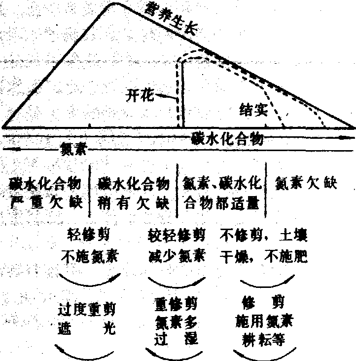 图3 苹果的各种栽培技术对碳水化合物——氮素比例和开花结实的影响 表2 不同的碳氮比状况对果树生长和结实的影响