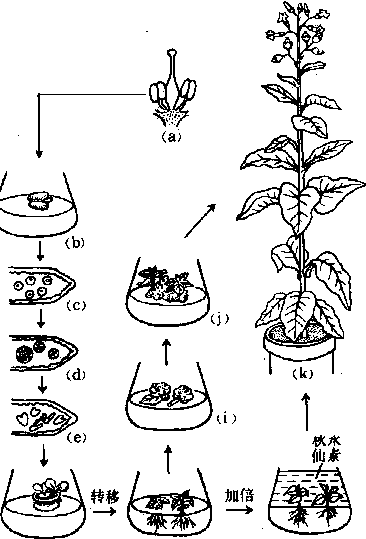 (a)除去雄蕊和雌蕊; (b)接种的花药; (c)、(d)、(e)花粉发育为胚状体; (f)单倍体花粉植株;(g)转移培养;(h)秋水仙素浸泡; (i)、(j)愈伤组织培养; (k)纯合二倍体植株
