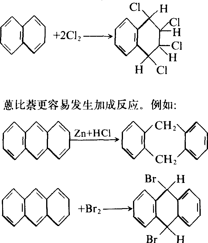 萘分子中碳碳键长不是完全平均化的,它的芳香性比苯差,较苯容易发生加成反应。在醇和金属钠存在下,萘可以被还原为1,4-二氢化萘或1,2,3,4-四氢化萘: