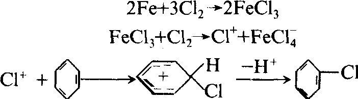 苯与单质氯在Fe存在下加热,苯环上的氢原子被氯原子取代,生成氯苯,同时放出氯化氢气体。此反应属于亲电取代,实际催化剂是三氯化铁,反应历程: