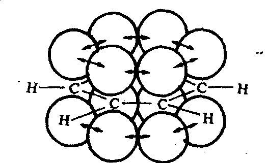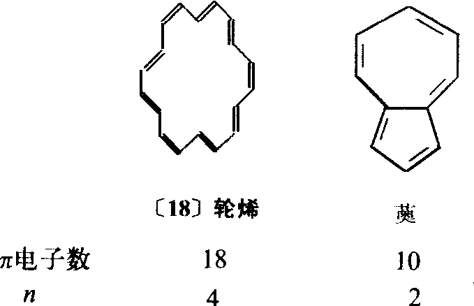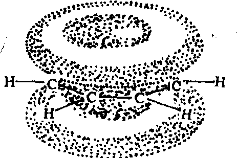 图3 苯分子π电子云示意图 苯分子中所有的原子都在同一平面内,所有的键角都为120°,6个碳原子形成正六边形的环。每个碳原子各有一个未参与杂化的p轨道(见图2),均垂直于碳环平面,互相平行,从侧面相互重叠,形成一个包括6个碳原子在内的闭合的共轭体系或称闭合的大π键,苯的π电子云 (见图3)是一个整体,均匀地对称分布在环平面的上方和下方。分子中无单、双键之分,每个碳碳键的长度都是0.140nm,介于C—C和C=C的键长之间,也有用还有某些烃,分子中不含苯环结构,但是具有芳香性,称为“非苯芳烃”。1936年德国物理学家E.休克尔提出,在一个平面上的环状共轭体系,其π电子数符合4n+2 (n为整数)时,就有芳香性。上述原则称为休克尔规则,如: