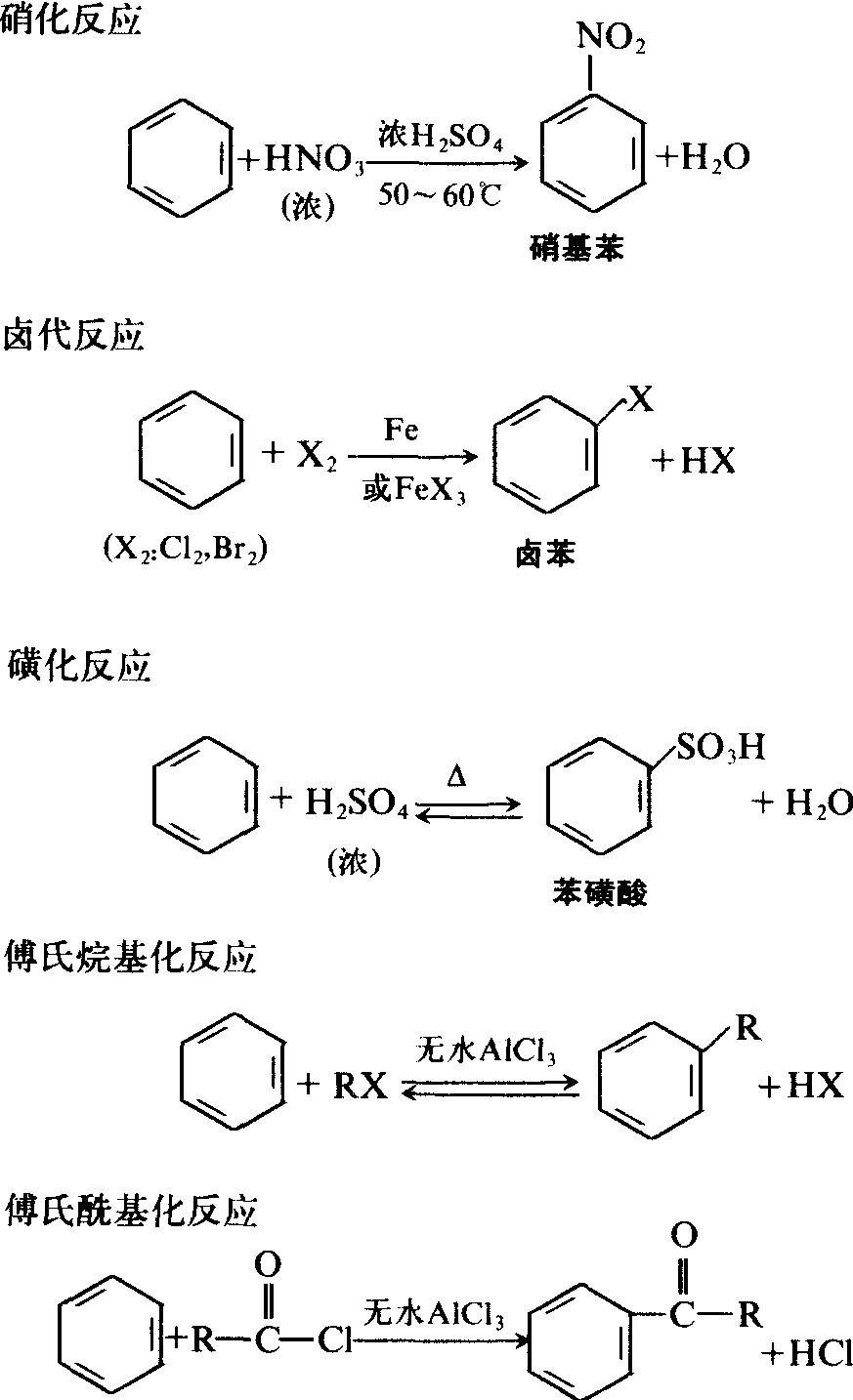 在常温下,芳烃为液体或固体; 不溶于水,能溶于有机溶剂。芳烃具有芳香性,容易和许多试剂发生取代反应 (参见“芳烃的卤代”、“芳烃的硝化”、“芳烃的磺化”、“傅氏反应”) 如:
