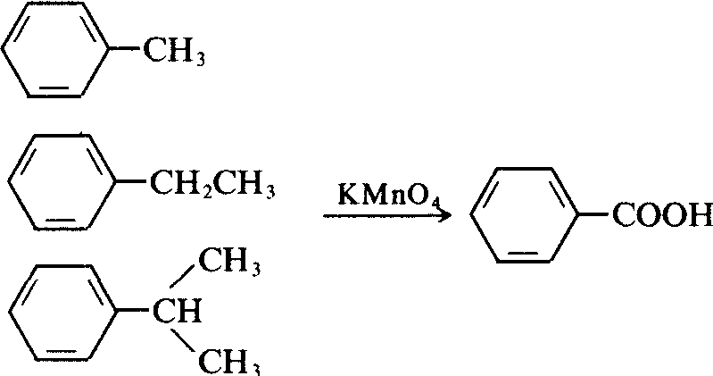 芳烃对氧化剂也很稳定,芳环不能被高锰酸钾氧化,但烃基取代的芳烃,当与苯环直接相连的碳原子上含有氢原子 (称α-H) 时,可以被高锰酸钾氧化,产物均为芳环上直接连有羧基,如: