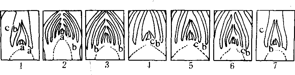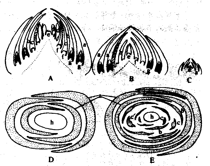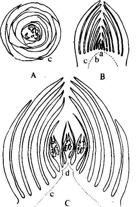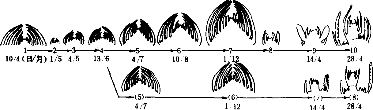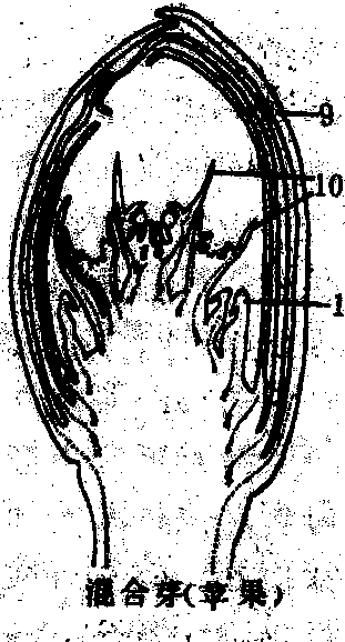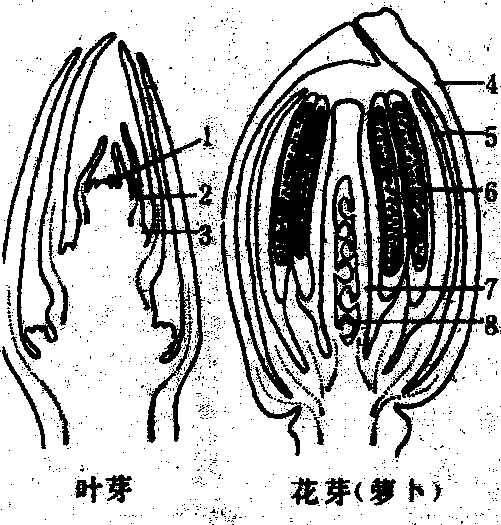 图 2 板栗芽的剖面构造 A. 混合芽; B. 叶芽; C. 副芽; (A, B, C为10月下旬芽的纵切片) D. 示4片鳞片的排列, 为芽的基部切片; E. 示鳞片、叶片、托叶在芽内的排列; (D, E为叶 当年形成的芽到冬季休眠时, 除纯花芽外, 芽内雏梢的节数或幼叶数, 决定于树种和芽发育的充实程度。苹果、梨、桃约3~5节, 山楂、葡萄约5~9节,栗、柿约5~12节。节数越多,芽发育越充实。冬季休眠后,到萌芽前, 有的芽芽内雏梢节数还会增加, 决定不同树种或不同类型枝条芽内雏梢部分的长短和节数的多少。 芽的形成和分化 落叶果树芽的形成过程, 大体要经过芽原基出现期、鳞片分化期和雏梢分化期(图3、4)。 ![]() 图 3 梨叶芽形成过程 1. 芽原基出现期,示新梢顶端生长点向顶芽转化; 2. 鳞片分化期;3. 质变期; 4. 冬季休眠前雏梢分化期; 5. 冬季休眠期; 6. 冬季休眠后雏梢分化期; 7. 同1, 示新梢顶端又开始向顶芽转化。 芽原基出现期 苹果、梨、桃、杏等芽内雏梢在冬季休眠时节数较少的芽, 在芽(母芽)形成的第二年春季,在芽内雏梢叶腋间出现新一代侧芽的原基。侧芽原基是由原表皮层及其内侧的一、二层细胞形成的。栗、柿、核桃、山楂等芽内雏梢在冬季休眠时节数较多的芽, 侧芽原基在母芽形成的当年, 在雏梢叶腋间出现。母芽萌发后,随雏梢节数的继续分化(芽外雏梢部分), 依次在雏梢叶腋出现侧芽原基。 ![]() 图 4 板栗混合芽和叶芽的形成过程 1~9为混合芽的发育过程; 1~4, (5)~(7)为叶芽的发育过程 顶芽无明显的芽原基出现期, 由雏梢顶端生长点分化鳞片而形成顶芽。 鳞片分化期 芽原基出现后,随即进行鳞片分化。苹果、梨、桃等果树的短枝, 其顶芽鳞片分化在母芽内即开始, 到母芽萌发, 鳞片数已分化完成。侧芽原基出现后, 随即分化鳞片, 到所从属的叶片面积停止生长, 侧芽鳞片数已分化完成。栗、柿、葡萄等芽鳞片数少的芽, 在芽从叶腋间显露时, 鳞片数已分化完成。 雏梢分化期 具纯花芽果树的芽, 在鳞片分化期之后,如具备形成花芽的内外条件, 即转向花芽分化。否则即进入雏梢分化期, 成为叶芽。栗、柿、葡萄等的芽, 继鳞片分化期之后, 即继续进行雏梢分化。雏梢分化到一定节数后, 芽已具备叶芽的基本构造, 在此基础上, 如具备形成花芽的内外条件, 芽即转化花芽分化(见花芽形成), 否则仍为叶芽。 落叶果树芽内雏梢分化过程, 大致分为冬前雏梢分化和冬后雏梢分化两个阶段。芽鳞片分化之后,随即进行的雏梢分化, 即为冬前雏梢分化阶段。落叶休眠期, 雏梢分化停止。休眠后, 有的芽继续进行雏梢分化, 增加节数; 有的芽, 不再增加雏梢节数或雏梢顶端转化为顶芽。 芽的特性 芽的着生部位和发生时期不同芽表现不同特性 芽的异质性 同一树种不同类型枝条及同一枝条不同部位的芽存在着差异现象。表现为芽鳞片多少、雏梢节数多少和芽大小不同, 从而使芽的萌发难易和发枝强弱不同。芽的异质性是由于营养、环境条件和芽的发育时期不同而造成的。果树的整形修剪和芽接等都要利用芽的异质性。 芽的熟性 有些果树新梢上当年形成的芽, 当年萌发, 形成二次枝、三次枝或更高次枝, 这种特性称芽的早熟性,这种芽称早熟性芽。葡萄、桃、枣、柑橘、荔枝等具早熟性芽的果树, 一年多次分枝, 树冠成形快, 结果早。另一些果树如苹果、梨、栗、核桃等芽形成的当年一般不萌发, 这种特性称芽的晚熟性, 这种芽称晚熟性芽。对枝条摘心, 可以促使晚熟性芽当年萌发, 增快分枝, 提早结果。 芽bud未伸展的雏型枝条、花或花序。发育为枝条的芽称为叶芽,由一具顶端分生组织的短茎以及许多叶原基和幼叶所组成,芽内幼叶呈现各种不同的卷叠状态,可作为物种识别的参考。发育为花或花序的芽称为花芽,内含萼片、花瓣、雄蕊、雌蕊原基或花序原始体。既形成枝叶又形成花或花序的芽称为混合芽。叶芽一般较瘦小,花芽和混合芽较为肥大(图1)。