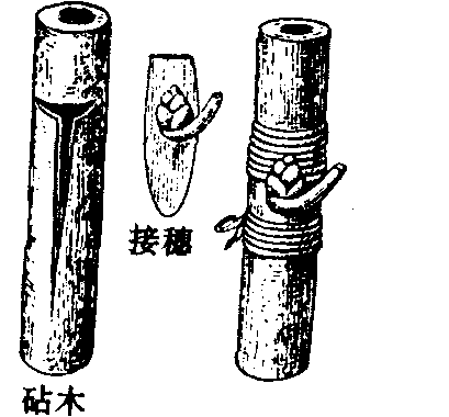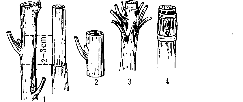 图 4 嵌芽接图 芽接花卉、果树等植物嫁接方法之一。芽接操作简便,成活率较高,应用最广。一般以“T”形芽接为主。最适时间在夏末秋初(6~8月份)进行,先将芽下一片叶的叶片剪去,仅留下一段叶柄,用芽接刀从芽的下方1~1.5厘米处,向上推进直达芽的上方1厘米处为止,再在芽的上方1厘米处横切一刀,深达木质部削下接穗(可稍带一薄层木质部)。再用芽接刀在已选好的砧木上横竖向各切一刀,呈“T”字形切口,深度以割透树皮为准,揭开树皮使之露出形成层,迅速把接穗(先去掉所带的一点木质部使形成层露出)嵌入,使接穗的上端与砧木的横切口对齐后,用塑料薄膜条绑紧(只露出接穗的芽点和叶柄),使接穗和砧木的形成层密切接合一起。10天左右,一触叶柄即可脱落,表示芽接成活。否则,需再补接。苹果、梨、桃、杏等果树,多用此法繁殖。落叶树种在第二年春天树液开始流动后,可在接口上方4~6厘米处将砧木上部剪掉,接穗可很快萌发。常绿树种,只要接穗成活后即可将砧木上部剪掉。